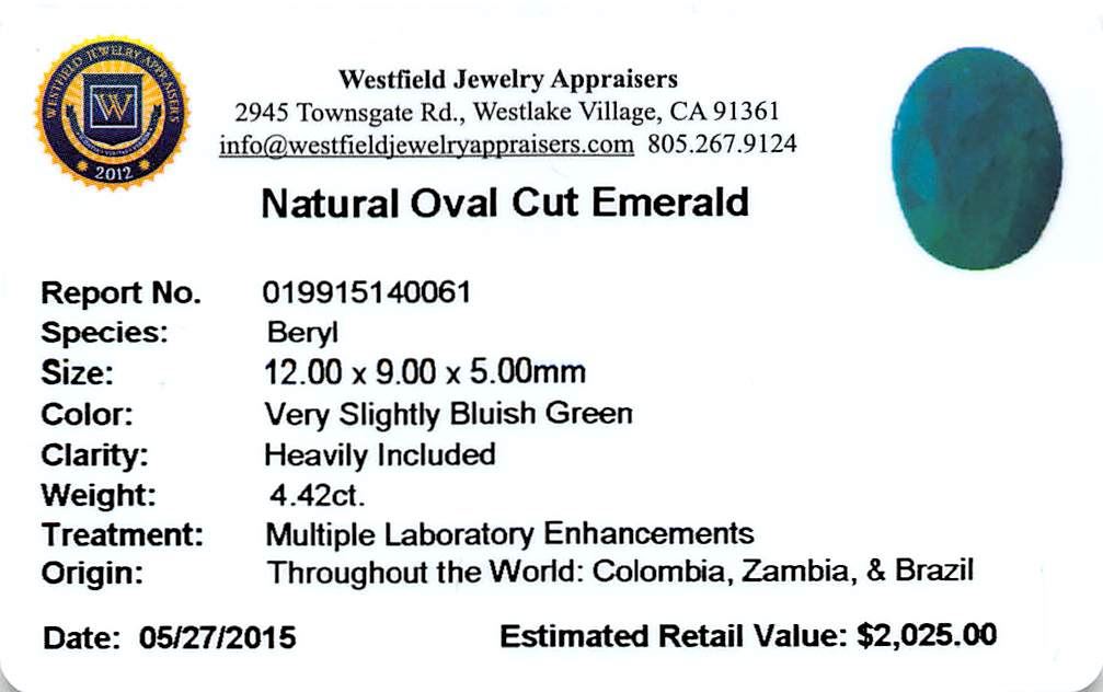 One oval mixed cut natural emerald, measuring 12.00 x 9.00 x 5.00mm, exact weight 4.42ct., clarity is heavily included, type III, medium dark, very slightly grayish, very slightly bluish green color, (GIA vslbG 6/3), cut is good. Transmitting light somewhat diffusely, translucent, Naturally occurring internal & external characteristics are present, Indications of multiple laboratory enhancements, including high temperature heat treatment. Westfield Appraised at $2,025.00.