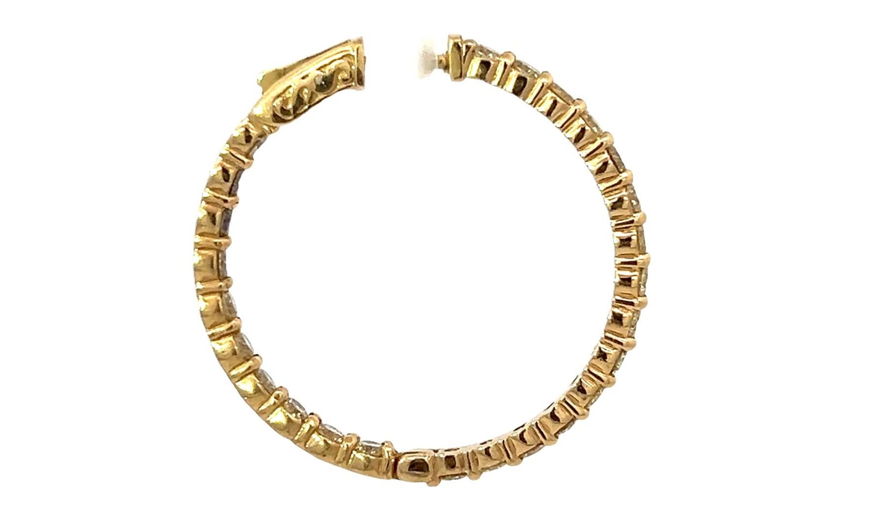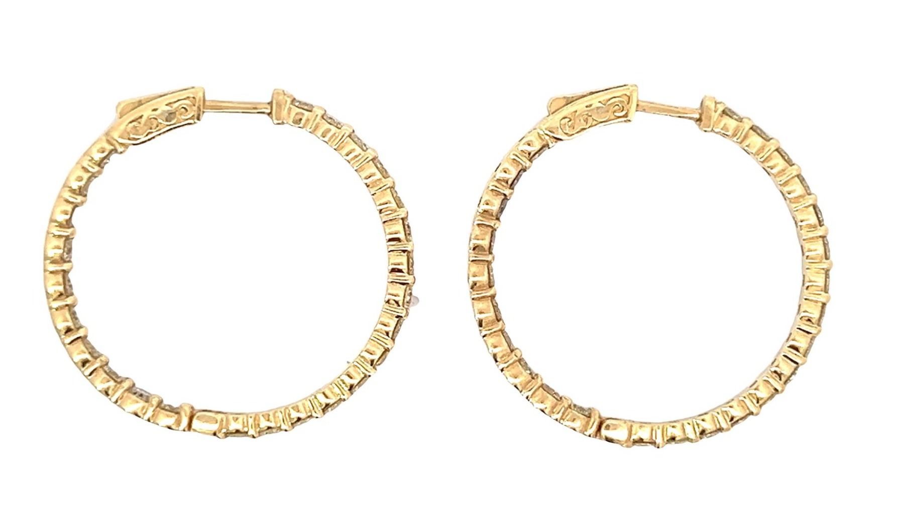 One pair electronically tested 14KT yellow gold lady's combination cast & assembled fashion inside-out hoop earrings with hinged, snap locking posts with a bright polish finish. The featured hoop earring has a diameter of 33.00 millimeter. Identified with markings of "14K". Condition is new, good workmanship. Containing: Fifty prong set round brilliant cut diamonds, measuring 2.83 - 2.75 x 1.79mm (depth est.) approximate total weight of 50 Stones = 4.43ct. Graded in the setting. Color I - K Clarity VS-2 to SI-1 Cut Very Good Total Weight of Diamonds 4.43ct. Total Weight of Earrings 11.50gm Estimated Retail Value $ 13260.00