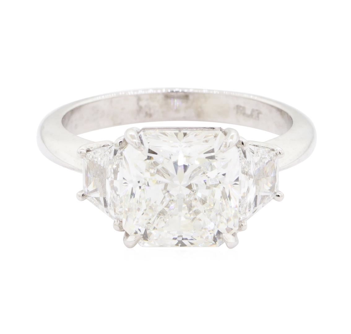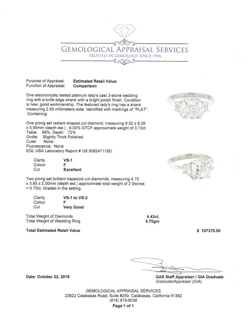 One electronically tested platinum lady's cast 3-stone wedding ring with a knife edge shank with a bright polish finish. The featured lady's ring has a shank measuring 2.45 millimeters wide. Identified with markings of 'PLAT'. Condition is new, good workmanship. Containing: One prong set radiant shaped cut diamond, measuring 8.52 x 8.26 x 5.95mm (depth est.) , 9.00.%. GTCF approximate weight of 3.73ct. Table: 69%. , Depth: 72%. Girdle: Slightly Thick PolishedCulet: NoneFluorescence: NoneEGL USA Laboratory Report # US 908247119D. Colour F Clarity VS-1 Cut Excellent Two prong set brilliant trapezoid cut diamonds, measuring 4.70 x 3.90 x 2.00mm (depth est.) approximate total weight of 2 Stones = 0.70ct. Graded in the setting. Colour F Clarity VS-1 to VS-2 Cut Very Good. Total Weight of Diamonds 4.43ct.. Total Weight of Wedding Ring 6.70gm GAS Appraised at $107375.00. GAS Appraised at $107,375.00.