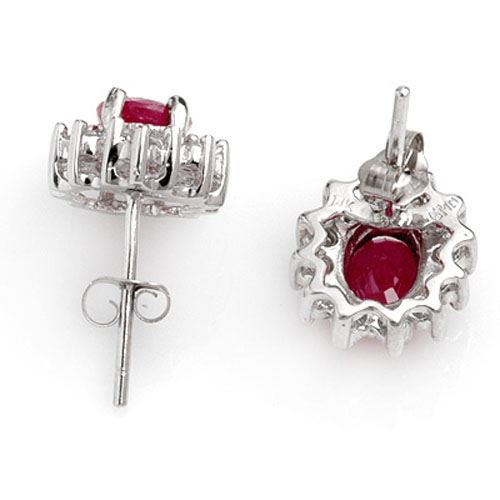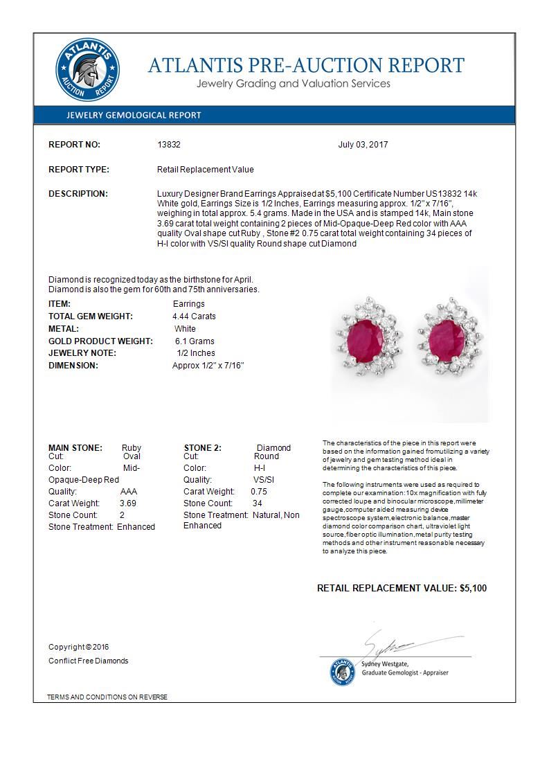 4.44 CTW Ruby & Diamond Earrings 14K White Gold ---- Luxury Designer Brand Earrings Appraised Retail Price at $5,100 ---- SKU Number US13832 14k White gold Earrings Size is 1/2 Inches, Earrings measuring approx. 1/2" x 7/16", weighing in total approx. 5.4 grams. Made in the USA and is stamped 14k, Main stone 3.69 carat total weight containing 2 pieces of Mid-Opaque-Deep Red color with AAA quality Oval shape cut Ruby , Stone #2 0.75 carat total weight containing 34 pieces of H-I color with VS/SI quality Round shape cut