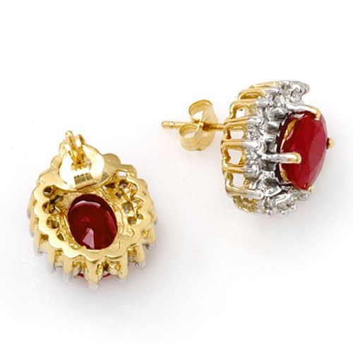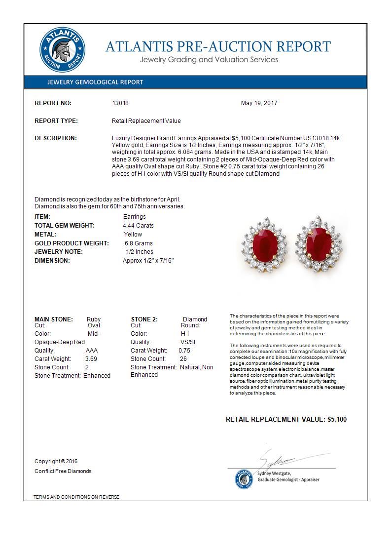 4.44 CTW Ruby & Diamond Earrings 14K Yellow Gold ---- Luxury Designer Brand Earrings Appraised Retail Price at $5,100 ---- SKU Number US13018 14k Yellow gold Earrings Size is 1/2 Inches, Earrings measuring approx. 1/2" x 7/16", weighing in total approx. 6.084 grams. Made in the USA and is stamped 14k, Main stone 3.69 carat total weight containing 2 pieces of Mid-Opaque-Deep Red color with AAA quality Oval shape cut Ruby , Stone #2 0.75 carat total weight containing 26 pieces of H-I color with VS/SI quality Round shape cut