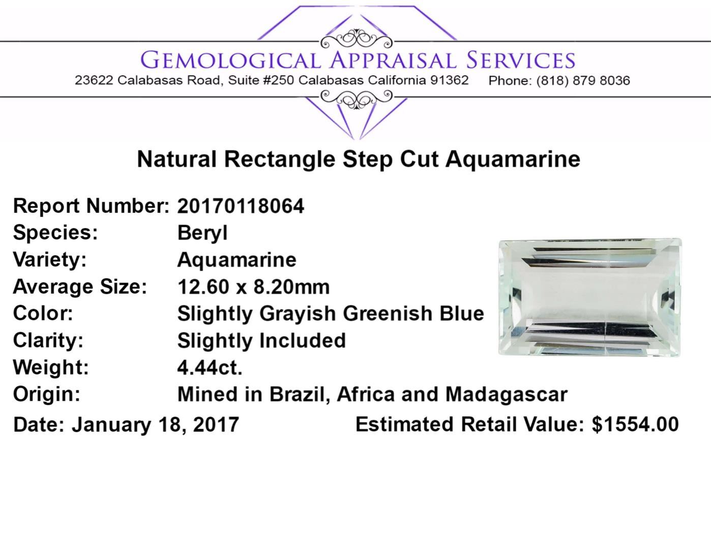 One natural rectangle step cut aquamarine with an exact weight of 4.44ct., clarity is slightly included, slightly grayish greenish blue. Gemological Appraisals Services estimates the retail value at $1554 GAS Appraised.