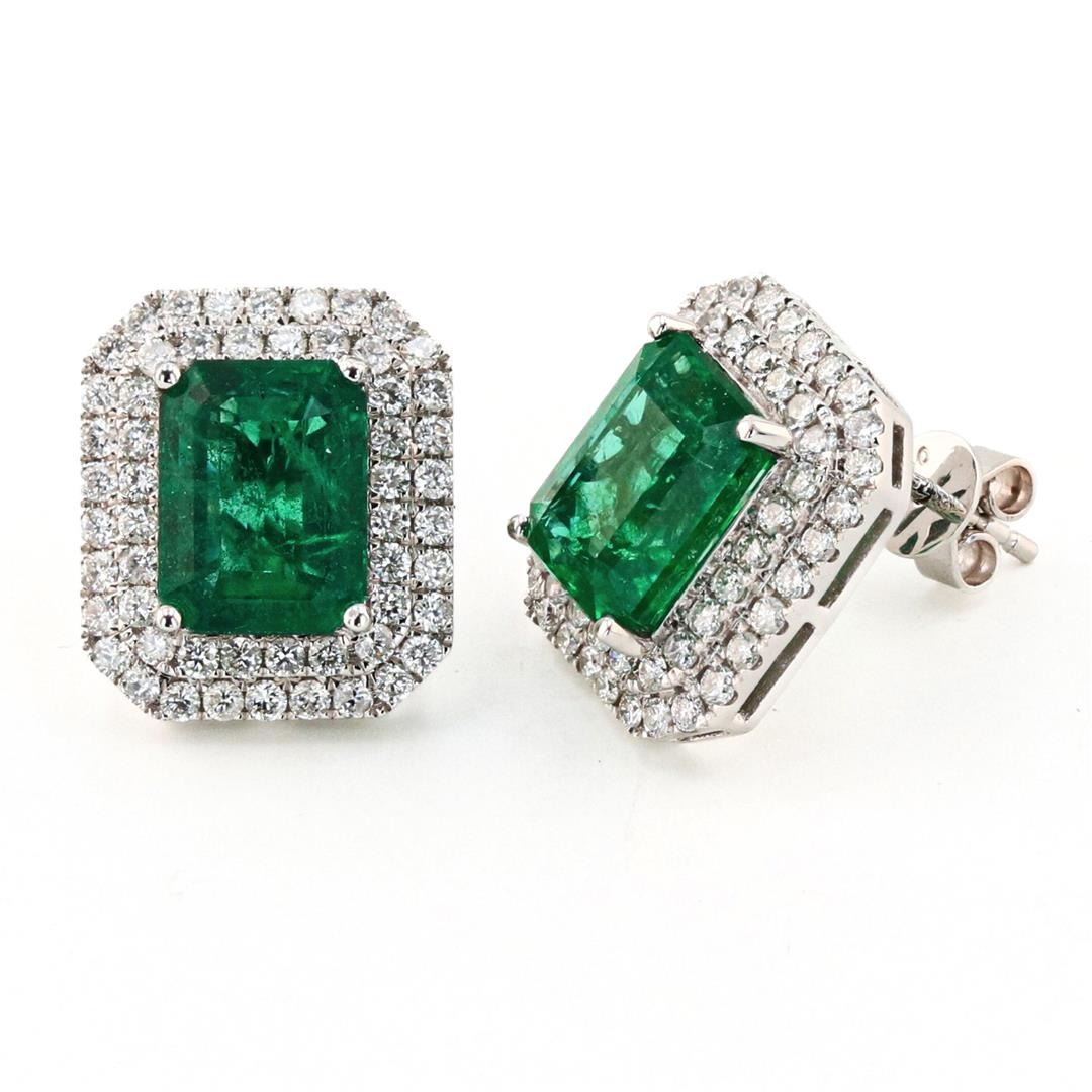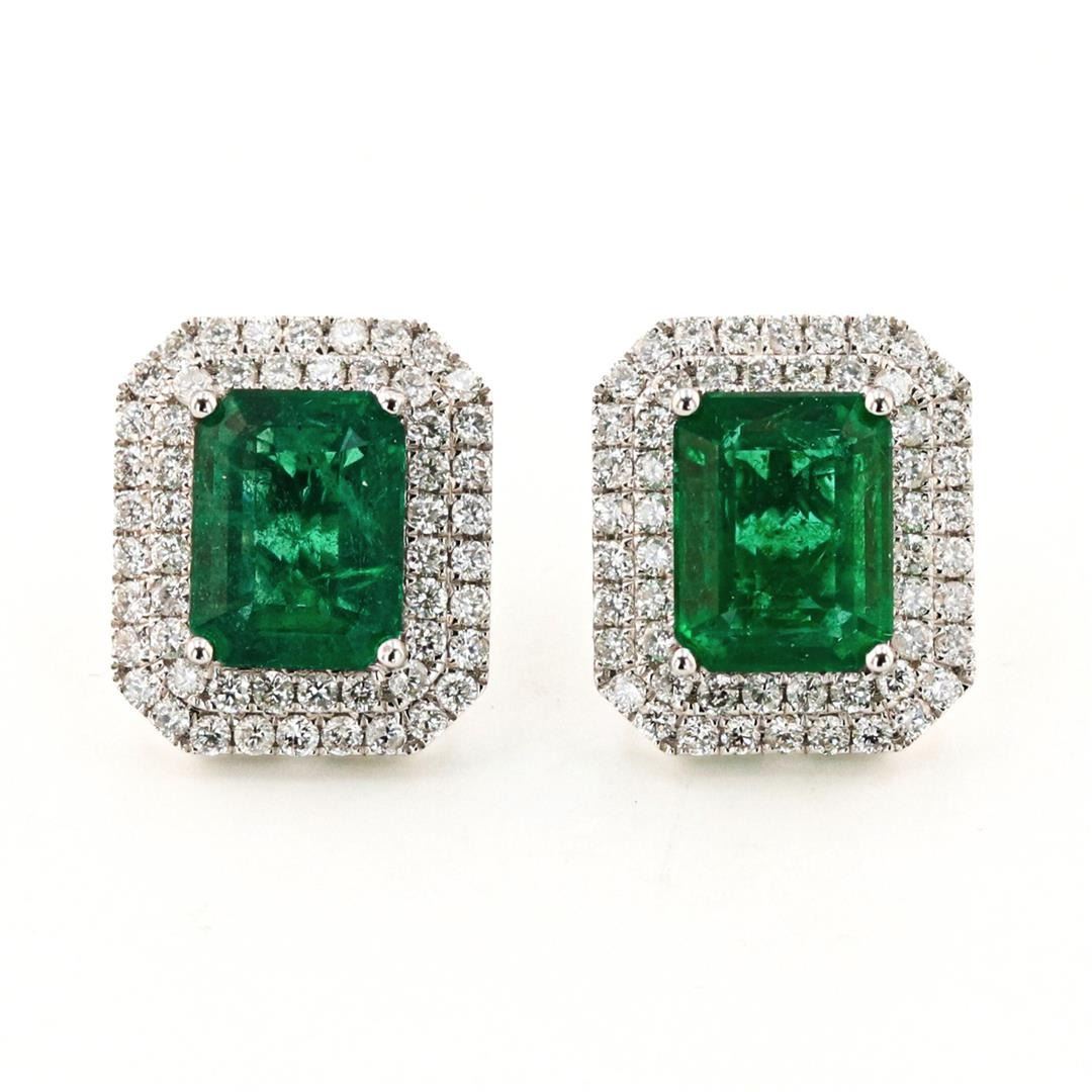 4.44ctw Emerald and 1.04ctw Diamond 18K White Gold Earrings. One polished, and tested, pair of 18K white gold earrings marked Oscar Friedman. The earrings are mounted with: 2 genuine emerald center stones weighing approximately 4.44 carats, and 108 genuine round diamonds weighing approximately 1.04 carats. This item weighs 6.9 grams, condition is new, excellent workmanship. MAIN GEMSTONES Species: Natural Beryl Variety: Emerald Shape: Rectangular Cut Cornered Cutting Style: Step Cut Quantity: 2 Emeralds Measurements: 9x 7mm Total Weight: 4.44 carats Color: Green Cut Grade: Very Good Refractive Index: 1.564 - 1.595 DR Birefringence: 0.005 to 0.009 Hardness: 7.5 - 8 ADJACENT GEMSTONES ON EARRINGS Identity: Natural Diamond Shape: Round Cutting Style: Brilliant Cut Quantity: 108 Diamonds Measurements: 1.3mm Total Weight: 1.04 carats Color Urade: G - H Clarity Grade: VS2 - SI1 Refractive Index: 2.417 Hardness: 10 TOTAL EMERALD WEIGHT: 4.44 cts TOTAL DIAMOND WEIGHT: 1.04 cts WEIGHT OF ITEM: 6.9 grams GOLD CONTENT: 18K White Gold