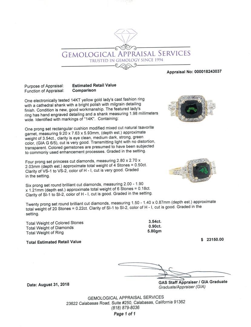 One electronically tested 14KT yellow gold lady's cast fashion ring with a cathedral shank with a bright polish with milgrain detailing finish. The featured lady's ring has hand engraved detailing and a shank measuring 1.98 millimeters wide. Identified with markings of '14K'. Condition is new, good workmanship. Containing: One prong set rectangular cushion modified mixed cut natural tsavorite garnet, measuring 9.20 x 7.63 x 5.93mm, (depth est.) approximate weight of 3.54ct., clarity is eye clean, medium dark, strong, green color, (GIA G 6/5), cut is very good. Transmitting light with no distortion, transparent. Colored gemstones are presumed to have been subjected to commonly used enhancement processes. Graded in the setting. Four prong set princess cut diamonds, measuring 2.80 x 2.70 x 2.03mm (depth est.) approximate total weight of 4 Stones = 0.50ct. Graded in the setting. Color H - I Clarity VS-1 to VS-2 Cut Very Good Six prong set round brilliant cut diamonds, measuring 2.00 - 1.90 x 1.21mm (depth est.) approximate total weight of 6 Stones = 0.18ct. Graded in the setting. Color H - I Clarity SI-1 to SI-2 Cut Good Twenty prong set round brilliant cut diamonds, measuring 1.50 - 1.40 x 0.87mm (depth est.) approximate total weight of 20 Stones = 0.22ct. Graded in the setting. Color H - I Clarity SI-1 to SI-2 Cut Good. Total Weight of Colored Stones 3.54ct.. Total Weight of Diamonds 0.90ct.. Total Weight of Ring 5.80gm GAS Appraised at $23150.00. GAS Appraised.