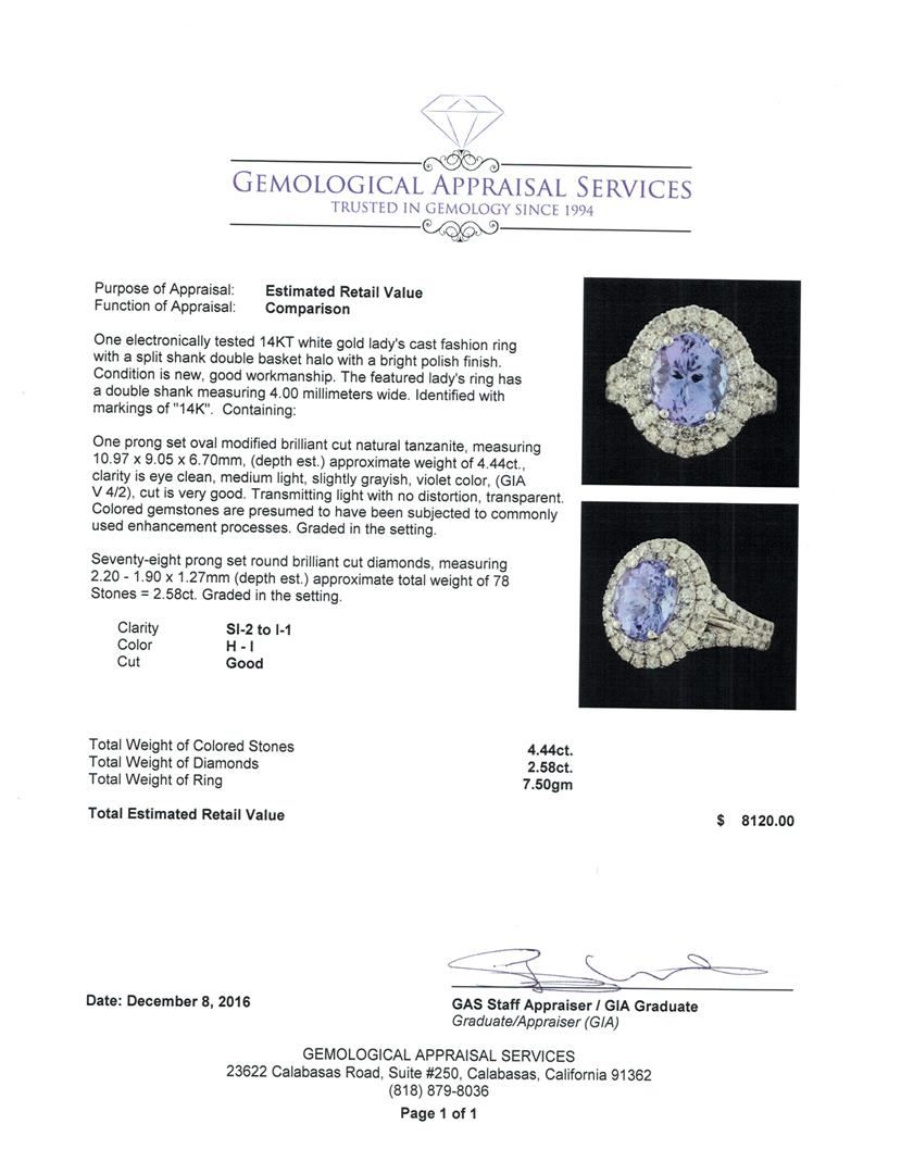 One electronically tested 14KT white gold lady's cast fashion ring with a split shank double basket halo with a bright polish finish. The featured lady's ring has a double shank measuring 4.00 millimeters wide. Identified with markings of '14K'. Condition is new, good workmanship. Containing: One prong set oval modified brilliant cut natural tanzanite, measuring 10.97 x 9.05 x 6.70mm, (depth est.) approximate weight of 4.44ct., clarity is eye clean, medium light, slightly grayish, violet color, (GIA V 4/2), cut is very good. Transmitting light with no distortion, transparent. Colored gemstones are presumed to have been subjected to commonly used enhancement processes. Graded in the setting. Seventy-Eight prong set round brilliant cut diamonds, measuring 2.20 - 1.90 x 1.27mm (depth est.) approximate total weight of 78 Stones = 2.58ct. Graded in the setting. Clarity SI-2 to I-1. Color: H - I Cut Good. Total Weight of Colored Stones 4.44ct.. Total Weight of Diamonds 2.58ct.. Total Weight of Ring 7.50gm. GAS Appraised at $8,120.00.