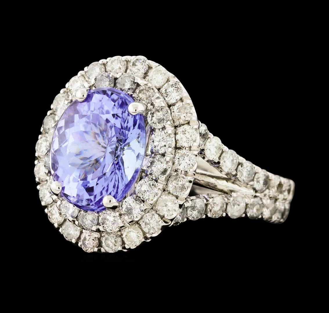 One electronically tested 14KT white gold lady's cast fashion ring with a split shank double basket halo with a bright polish finish. The featured lady's ring has a double shank measuring 4.00 millimeters wide. Identified with markings of '14K'. Condition is new, good workmanship. Containing: One prong set oval modified brilliant cut natural tanzanite, measuring 10.97 x 9.05 x 6.70mm, (depth est.) approximate weight of 4.44ct., clarity is eye clean, medium light, slightly grayish, violet color, (GIA V 4/2), cut is very good. Transmitting light with no distortion, transparent. Colored gemstones are presumed to have been subjected to commonly used enhancement processes. Graded in the setting. Seventy-Eight prong set round brilliant cut diamonds, measuring 2.20 - 1.90 x 1.27mm (depth est.) approximate total weight of 78 Stones = 2.58ct. Graded in the setting. Clarity SI-2 to I-1. Color: H - I Cut Good. Total Weight of Colored Stones 4.44ct.. Total Weight of Diamonds 2.58ct.. Total Weight of Ring 7.50gm. GAS Appraised at $8,120.00.