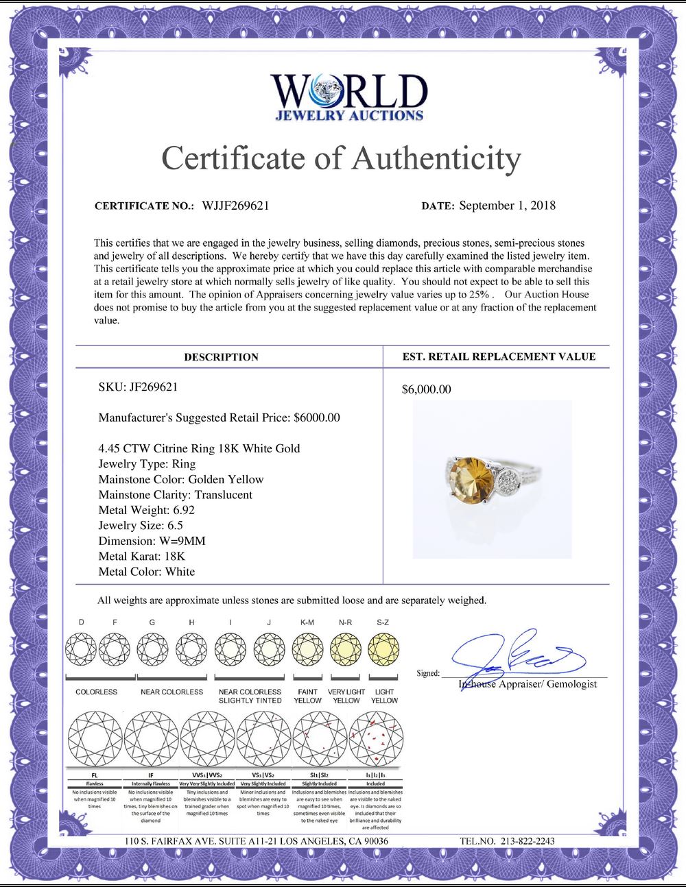 REF-79N7Y - JF269621 ---- 4.45 CTW Citrine & White Round Diamond Ring 18K White Gold
