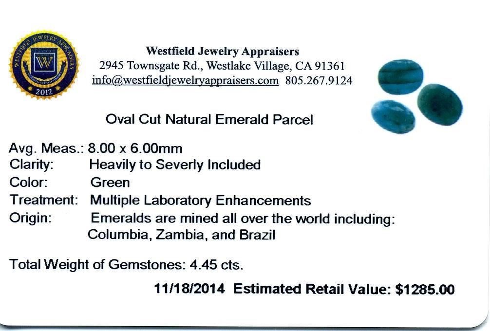4.45cts. Oval Cut Natural Emerald Parcel Westfield Appraised at $1,285.00.