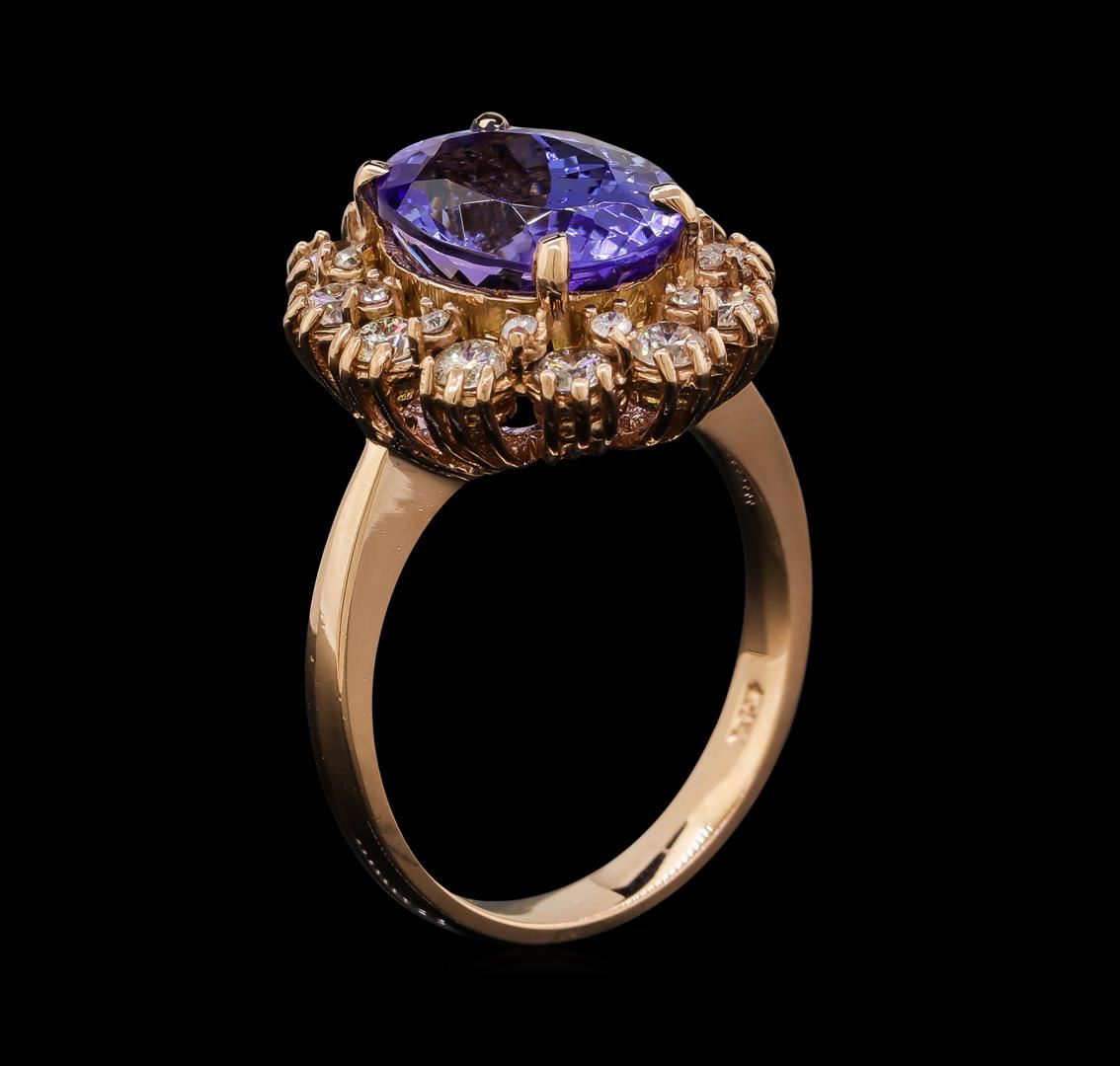 One electronically tested 14KT rose gold lady's cast fashion ring with a basket halo with a bright polish finish. The featured lady's ring has a shank measuring 2.98 millimeters wide. Identified with markings of 'K14'. Condition is new, good workmanship. Containing: One prong set oval modified brilliant cut natural tanzanite, measuring 11.67 x 8.49 x 6.22mm, (depth est.) approximate weight of 4.45ct., clarity is eye clean, medium, very slightly grayish, bluish violet color, (GIA bV 5/3), cut is good. Transmitting light with no distortion, transparent. Colored gemstones are presumed to have been subjected to commonly used enhancement processes. Graded in the setting. Twelve prong set round brilliant cut diamonds, measuring 2.65 - 2.55 x 1.61mm (depth est.) approximate total weight of 12 Stones = 0.80ct. Graded in the setting. Clarity SI-1 to I-1. Color: G - I Cut Good Twelve prong set round brilliant cut diamonds, measuring 1.35 - 1.25 x 0.81mm (depth est.) approximate total weight of 12 Stones = 0.10ct. Graded in the setting. Clarity SI-1 to I-1. Color: G - I Cut Good. Total Weight of Colored Stones 4.45ct.. Total Weight of Diamonds 0.90ct.. Total Weight of Ring 6.20gm. GAS Appraised at $8,810.00.