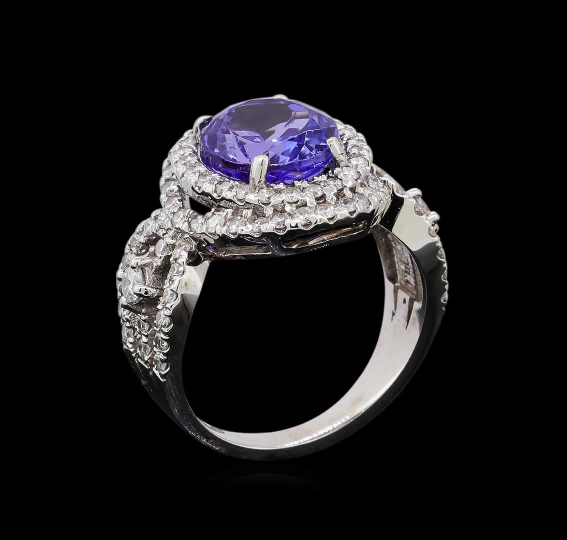 One electronically tested 14KT white gold lady's combination cast & assembled fashion ring with a crossover shank double halo with a bright polish finish. The featured lady's ring has a shank measuring 2.72 millimeters in width. Identified with markings of 'K14'. Condition is new, good workmanship. Containing: Two prong set round brilliant cut diamonds, measuring 2.70 - 2.65 x 1.66mm (depth est.) approximate total weight of 2 Stones = 0.15ct. Graded in the setting. Clarity SI-1 to SI-2. Color: G - H Cut Good Eighty-Eight prong set round brilliant cut diamonds, measuring 1.50 - 1.45 x 0.89mm (depth est.) approximate total weight of 88 Stones = 1.03ct. Graded in the setting. Clarity SI-1 to SI-2. Color: G - I Cut Good One prong set oval modified brilliant cut natural tanzanite, measuring 10.52 x 9.13 x 6.07mm, (depth est.) approximate weight of 4.45ct., clarity is eye clean, medium light, very slightly grayish, bluish violet color, (GIA bV 4/3), cut is very good. Transmitting light with no distortion, transparent. Colored gemstones are presumed to have been subjected to commonly used enhancement processes. Graded in the setting. Total Weight of Colored Stones 4.45ct.. Total Weight of Diamonds 1.18ct.. Total Weight of Ring 7.50gm. GAS Appraised at $8,755.00.
