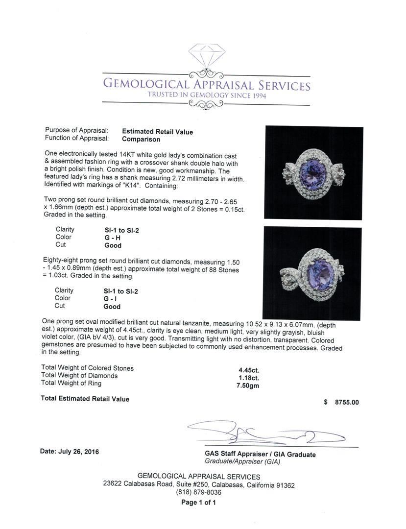 One electronically tested 14KT white gold lady's combination cast & assembled fashion ring with a crossover shank double halo with a bright polish finish. The featured lady's ring has a shank measuring 2.72 millimeters in width. Identified with markings of 'K14'. Condition is new, good workmanship. Containing: Two prong set round brilliant cut diamonds, measuring 2.70 - 2.65 x 1.66mm (depth est.) approximate total weight of 2 Stones = 0.15ct. Graded in the setting. Clarity SI-1 to SI-2. Color: G - H Cut Good Eighty-Eight prong set round brilliant cut diamonds, measuring 1.50 - 1.45 x 0.89mm (depth est.) approximate total weight of 88 Stones = 1.03ct. Graded in the setting. Clarity SI-1 to SI-2. Color: G - I Cut Good One prong set oval modified brilliant cut natural tanzanite, measuring 10.52 x 9.13 x 6.07mm, (depth est.) approximate weight of 4.45ct., clarity is eye clean, medium light, very slightly grayish, bluish violet color, (GIA bV 4/3), cut is very good. Transmitting light with no distortion, transparent. Colored gemstones are presumed to have been subjected to commonly used enhancement processes. Graded in the setting. Total Weight of Colored Stones 4.45ct.. Total Weight of Diamonds 1.18ct.. Total Weight of Ring 7.50gm. GAS Appraised.