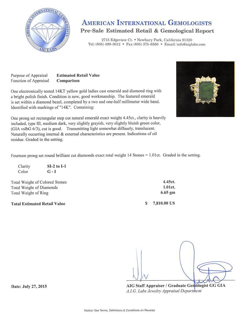 One electronically tested 14KT yellow gold ladies cast emerald and diamond ring with a bright polish finish. The featured emerald is set within a diamond bezel, completed by a two and one-half millimeter wide band. Identified with markings of "14K". Condition is new, good workmanship. Containing: One prong set rectangular step cut natural emerald exact weight 4.45ct., clarity is heavily included, type III, medium dark, very slightly grayish, very slightly bluish green color, (GIA vslbG 6/3), cut is good. Transmitting light somewhat diffusely, translucent. Naturally occurring internal & external characteristics are present. Indications of oil residue. Graded in the setting. Fourteen prong set round brilliant cut diamonds exact total weight 14 Stones = 1.01ct. Graded in the setting. Clarity: SI-2 to I-1. Color: G - I. Total Weight of Colored Stones 4.45ct. Total Weight of Diamonds 1.01ct. Total Weight of Ring 6.65gm. AIG Appraised at $7,810.00.