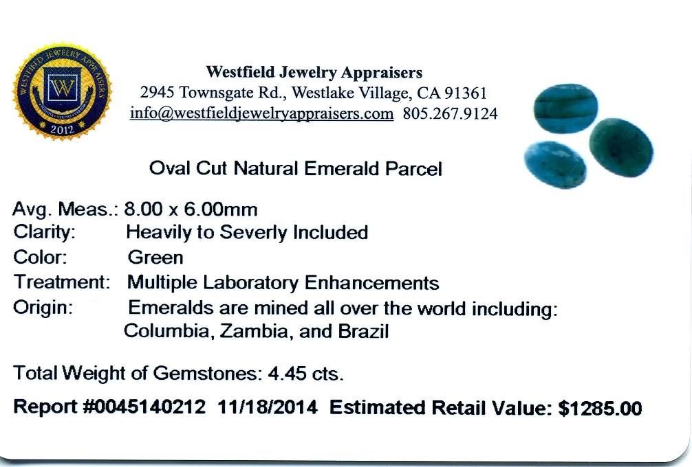 4.45cts. Oval Cut Natural Emerald Parcel Westfield Appraised at $1,285.00.