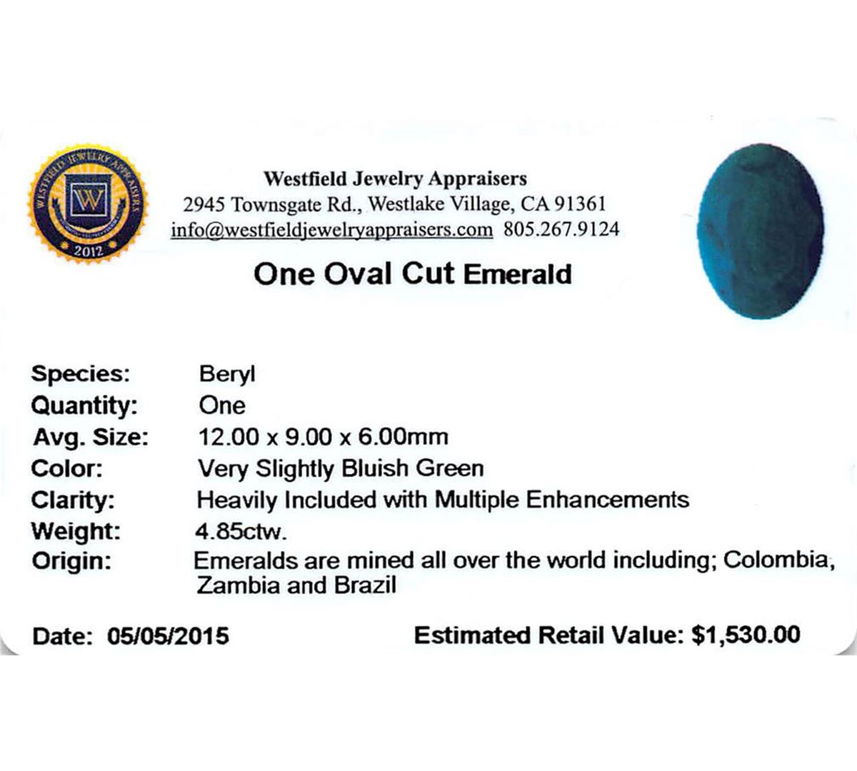 One oval mixed cut natural emerald, measuring 12.00 x 9.00 x 6.00mm, exact weight 4.45ct., clarity is heavily included, type III, medium dark, very slightly grayish, very slightly bluish green color, (GIA vslbG 6/3), cut is good. Indications of multiple laboratory enhancements, including high temperature heat treatment. Westfield Appraised at $1,540.00.