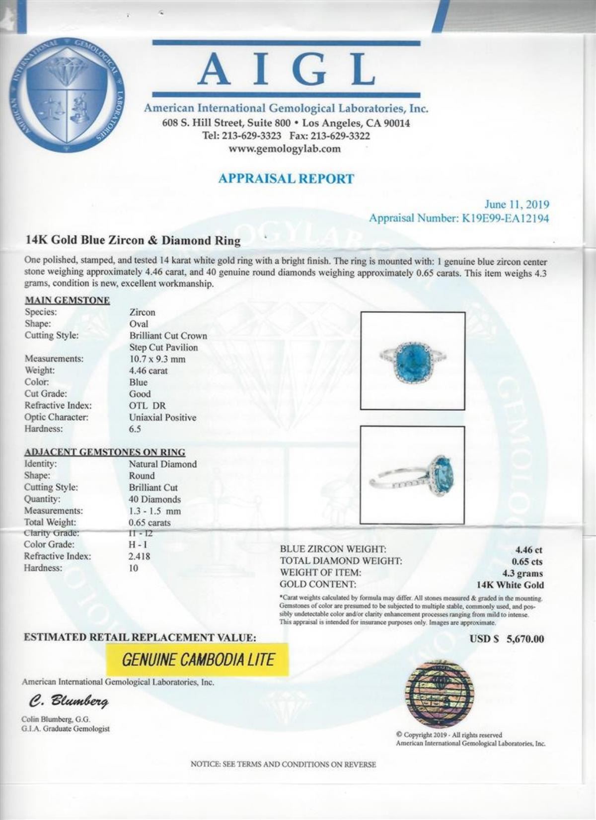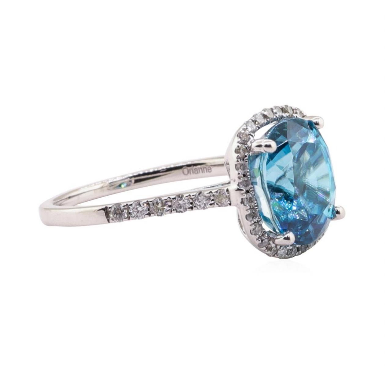 One 4.46ct Blue Zircon and Diamond Ring - 14KT White Gold. AIG certified. See Appraisal for more details. AIG Appraised.