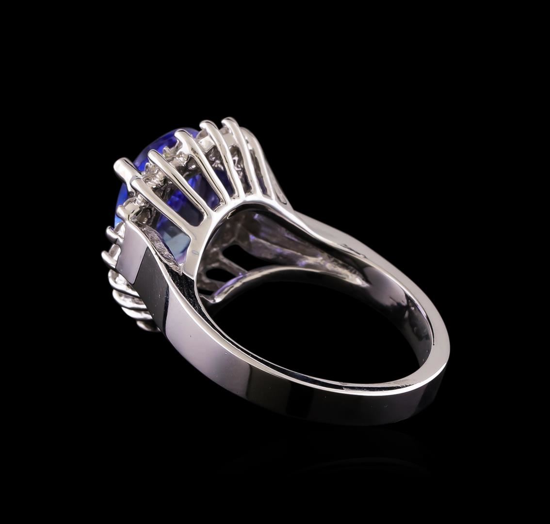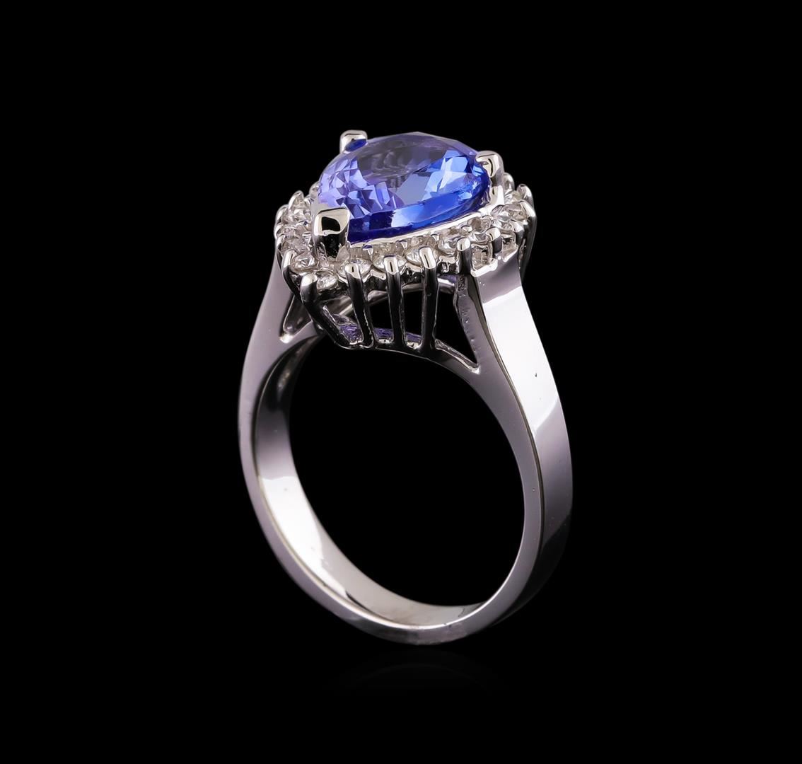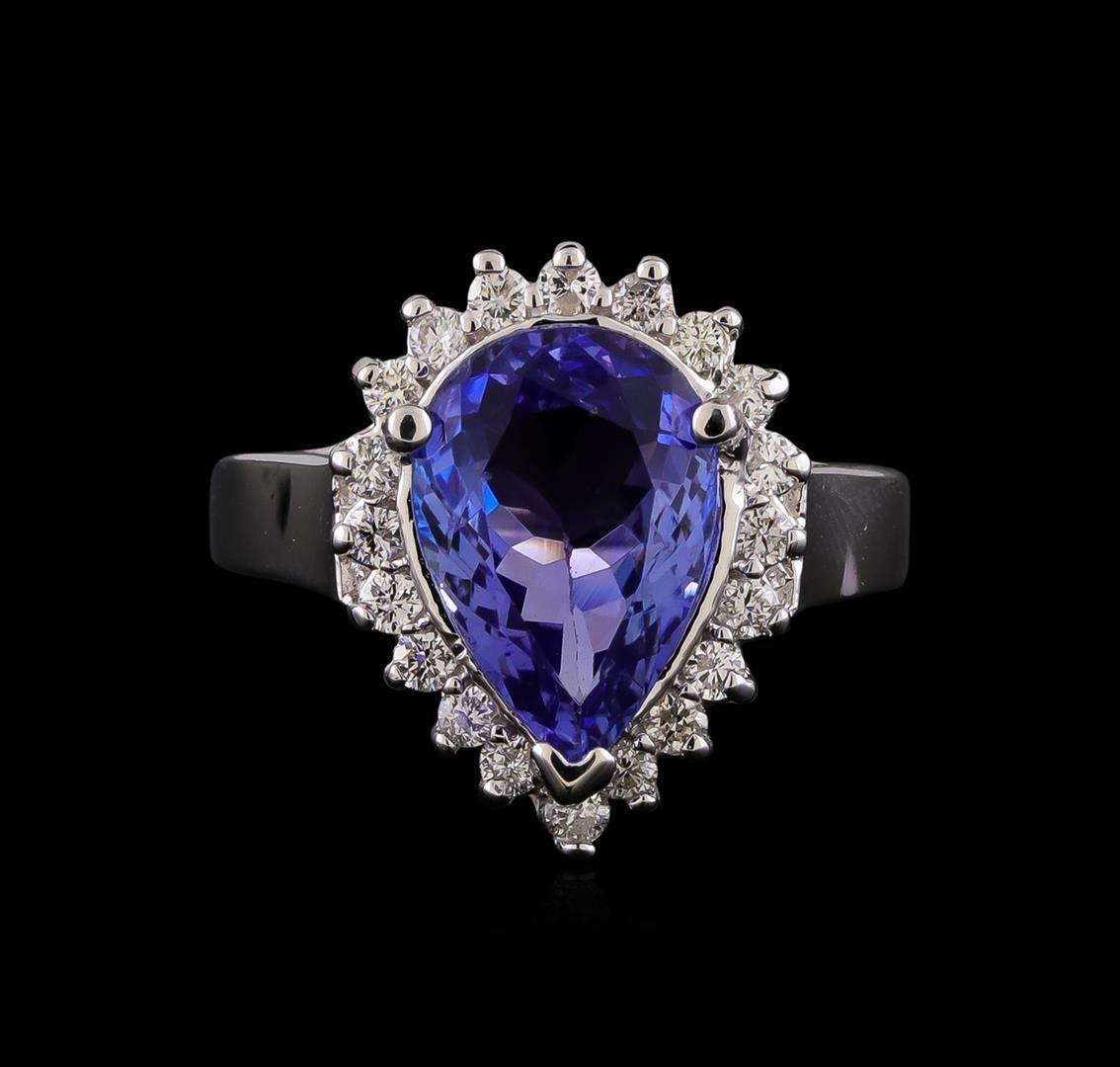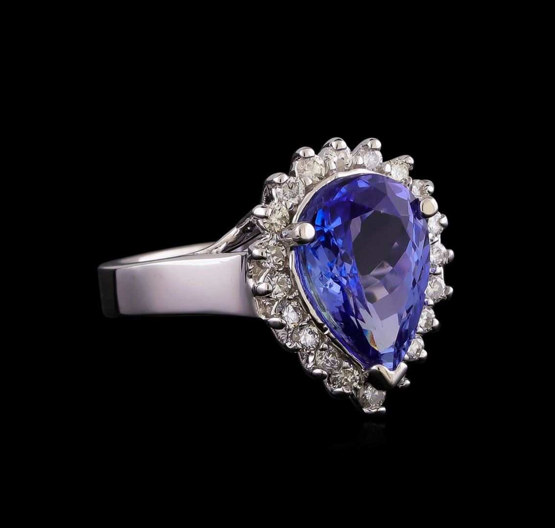 One electronically tested 14KT white gold lady's cast fashion ring with a basket halo with a bright polish finish. The featured lady's ring has a shank measuring 3.06 millimeters wide. Identified with markings of "14K". Condition is new, good workmanship. Containing: One prong set pear modified brilliant cut natural tanzanite, measuring 12.90 x 8.87 x 5.62mm, (depth est.) 4%. bulge factor, approximate weight of 4.46ct., clarity is eye clean, medium light, moderately strong, bluish violet color, (GIA bV 4/4), cut is very good. Transmitting light with no distortion, transparent. Colored gemstones are presumed to have been subjected to commonly used enhancement processes. Graded in the setting. Twenty prong set round brilliant cut diamonds, measuring 1.90 - 1.80 x 1.15mm (depth est.) approximate total weight of 20 Stones = 0.50ct. Graded in the setting. Clarity: SI-1 to SI-2. Color: H - I. Cut Good. Total Weight of Colored Stones 4.46ct. Total Weight of Diamonds 0.50ct. Total Weight of Ring 7.90gm. GAS Appraised at $8,360.00.