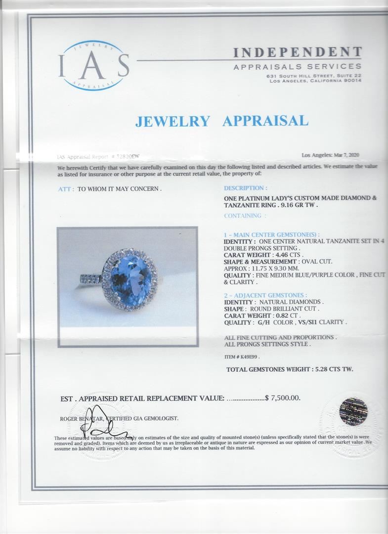 One 4.46ct Tanzanite and Diamond Ring - Platinum. IAS certified. See Appraisal for more details.
