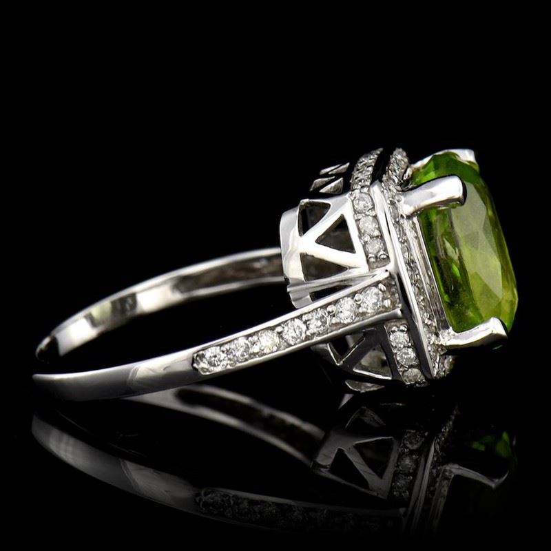 14K WHITE GOLD PERIDOT RING : 4.82 GRAMS / DIAMOND : 0.45CT / PERIDOT : 4.46CT / #GVR1014 **Eyes will fill with adoration when the light strikes this rare green 4.46ct oval cut Natural Peridot, a stone which can be used to bless and energize one's work. The brilliant hue is brightened by a twinkling 0.45ct round cut diamond surround. Artfully mounted in 14kt white gold, this cocktail ring is an investment piece, casting a spell upon all in its presence. **