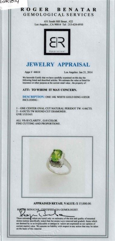 14K WHITE GOLD PERIDOT RING : 4.82 GRAMS / DIAMOND : 0.45CT / PERIDOT : 4.46CT / #GVR1014 **Eyes will fill with adoration when the light strikes this rare green 4.46ct oval cut Natural Peridot, a stone which can be used to bless and energize one's work. The brilliant hue is brightened by a twinkling 0.45ct round cut diamond surround. Artfully mounted in 14kt white gold, this cocktail ring is an investment piece, casting a spell upon all in its presence. **