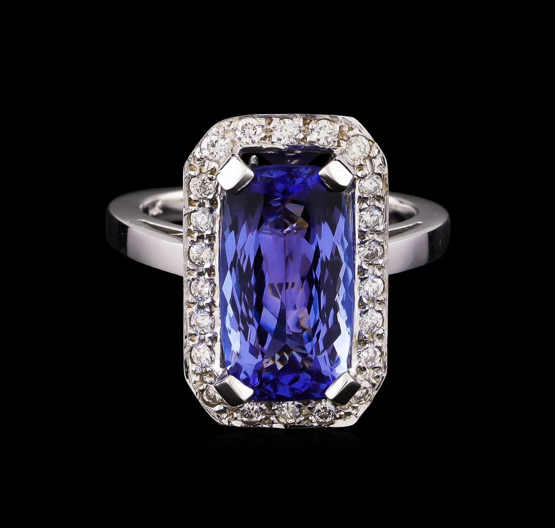 One electronically tested 14KT white gold lady's cast fashion ring with a cathedral halo with a bright polish finish. The featured lady's ring has a shank measuring 1.99 millimeters wide. Identified with markings of "14K". Condition is new, good workmanship. Containing: One prong set rectangular cushion modified brilliant cut natural tanzanite, measuring 13.93 x 7.72 x 5.02mm, 5%. bulge factor, approximate weight of 4.47ct., clarity is eye clean, medium light, moderately strong, bluish violet color, (GIA bV 4/4), cut is very good. Transmitting light with no distortion, transparent. Colored gemstones are presumed to have been subjected to commonly used enhancement processes. Graded in the setting. Twenty-Two prong set round brilliant cut diamonds, measuring 1.60 - 1.50 x 0.96mm (depth est.) approximate total weight of 22 Stones = 0.32ct. Graded in the setting. Clarity: VS-2 to SI-2. Color: G - Good. Total Weight of Colored Stones 4.47ct. Total Weight of Diamonds 0.32ct. Total Weight of Ring 6.80gm. GAS Appraised at $7,905.00.