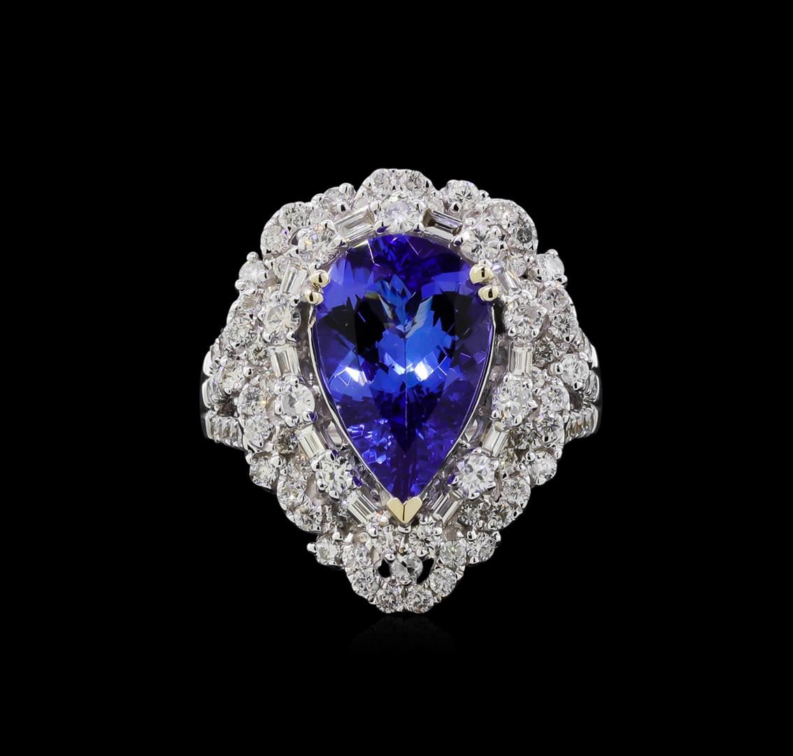 One electronically tested 14KT white gold ladies cast tanzanite and diamond ring with a bright polish finish. The featured tanzanite is set within tiered stylized diamond bezel supported by diamond set three-way split shoulders, completed by a two and one-half millimeter wide band. Trademark is Orianne. Identified with markings of "14K". Condition is new, good workmanship. Containing: One prong set pear mixed cut natural tanzanite, measuring 13.80 x 8.80 x 5.18mm, 6%. bulge factor, approximate weight of 4.47ct., clarity is eye clean, type I, medium dark, very slightly grayish, bluish violet color, (GIA bV 6/3), cut is good. Transmitting light with no distortion, transparent. Graded in the setting. Tanzanite is a very rare gemstone that is only found in the country of Tanzania. Originally discovered in 1967. Tiffany & Company, named the stone Tanzanite. It is found in the Usumburu Mountains that border the Umba Valley of northern Tanzania. Tanzanite occurs in gray, brown, violet, blue, reddish-purple, & green. The gem is interesting because of its exceptional pleochroism. Rotated in different directions a tanzanite will exhibit multiple changes of color. Tanzanite has a low tolerance to ultrasonic cleaning, and should not be cleaned using this method. One Hundred One prong set round brilliant & baguette cut diamonds approximate total weight of 101 Stones = 1.50ct. Graded in the setting. Clarity: VS-2 to I-1. Color: G - I. Total Weight of Colored Stones 4.47ct. Total Weight of Diamonds 1.50ct. Total Weight of Ring 7.83gm. AIG Appraised at $15,820.00.