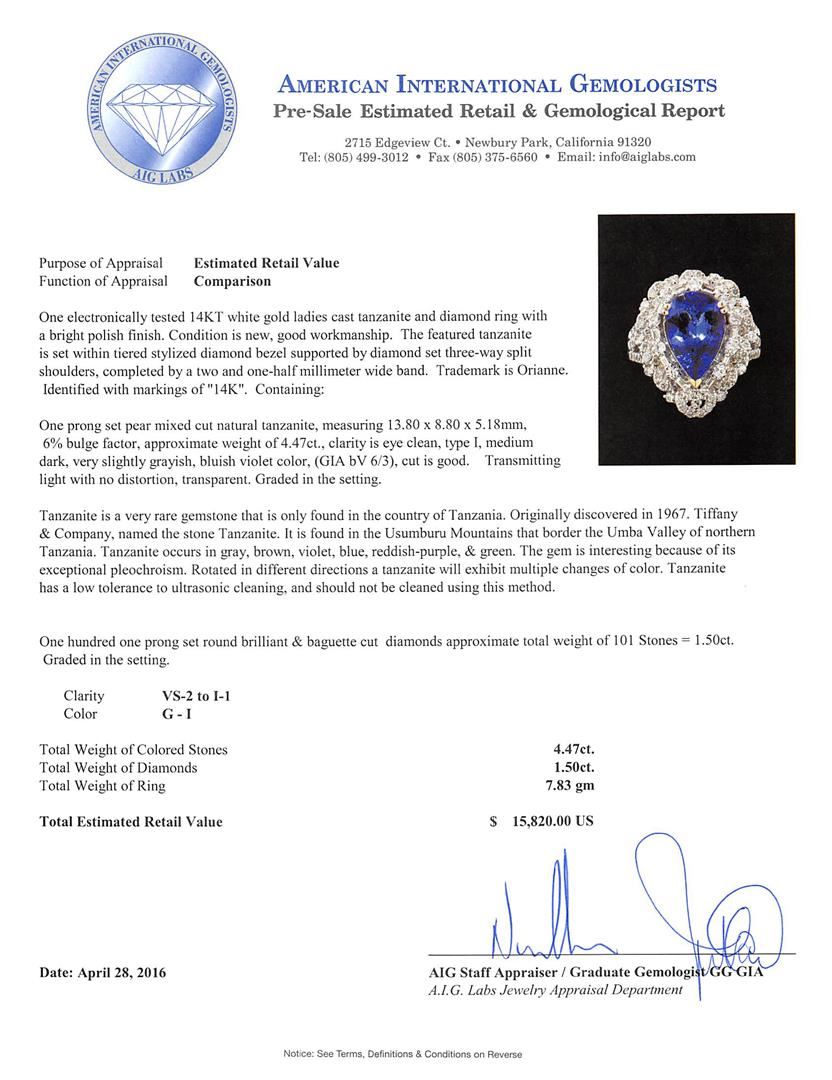 One electronically tested 14KT white gold ladies cast tanzanite and diamond ring with a bright polish finish. The featured tanzanite is set within tiered stylized diamond bezel supported by diamond set three-way split shoulders, completed by a two and one-half millimeter wide band. Trademark is Orianne. Identified with markings of "14K". Condition is new, good workmanship. Containing: One prong set pear mixed cut natural tanzanite, measuring 13.80 x 8.80 x 5.18mm, 6%. bulge factor, approximate weight of 4.47ct., clarity is eye clean, type I, medium dark, very slightly grayish, bluish violet color, (GIA bV 6/3), cut is good. Transmitting light with no distortion, transparent. Graded in the setting. Tanzanite is a very rare gemstone that is only found in the country of Tanzania. Originally discovered in 1967. Tiffany & Company, named the stone Tanzanite. It is found in the Usumburu Mountains that border the Umba Valley of northern Tanzania. Tanzanite occurs in gray, brown, violet, blue, reddish-purple, & green. The gem is interesting because of its exceptional pleochroism. Rotated in different directions a tanzanite will exhibit multiple changes of color. Tanzanite has a low tolerance to ultrasonic cleaning, and should not be cleaned using this method. One Hundred One prong set round brilliant & baguette cut diamonds approximate total weight of 101 Stones = 1.50ct. Graded in the setting. Clarity: VS-2 to I-1. Color: G - I. Total Weight of Colored Stones 4.47ct. Total Weight of Diamonds 1.50ct. Total Weight of Ring 7.83gm. AIG Appraised at $15,820.00.
