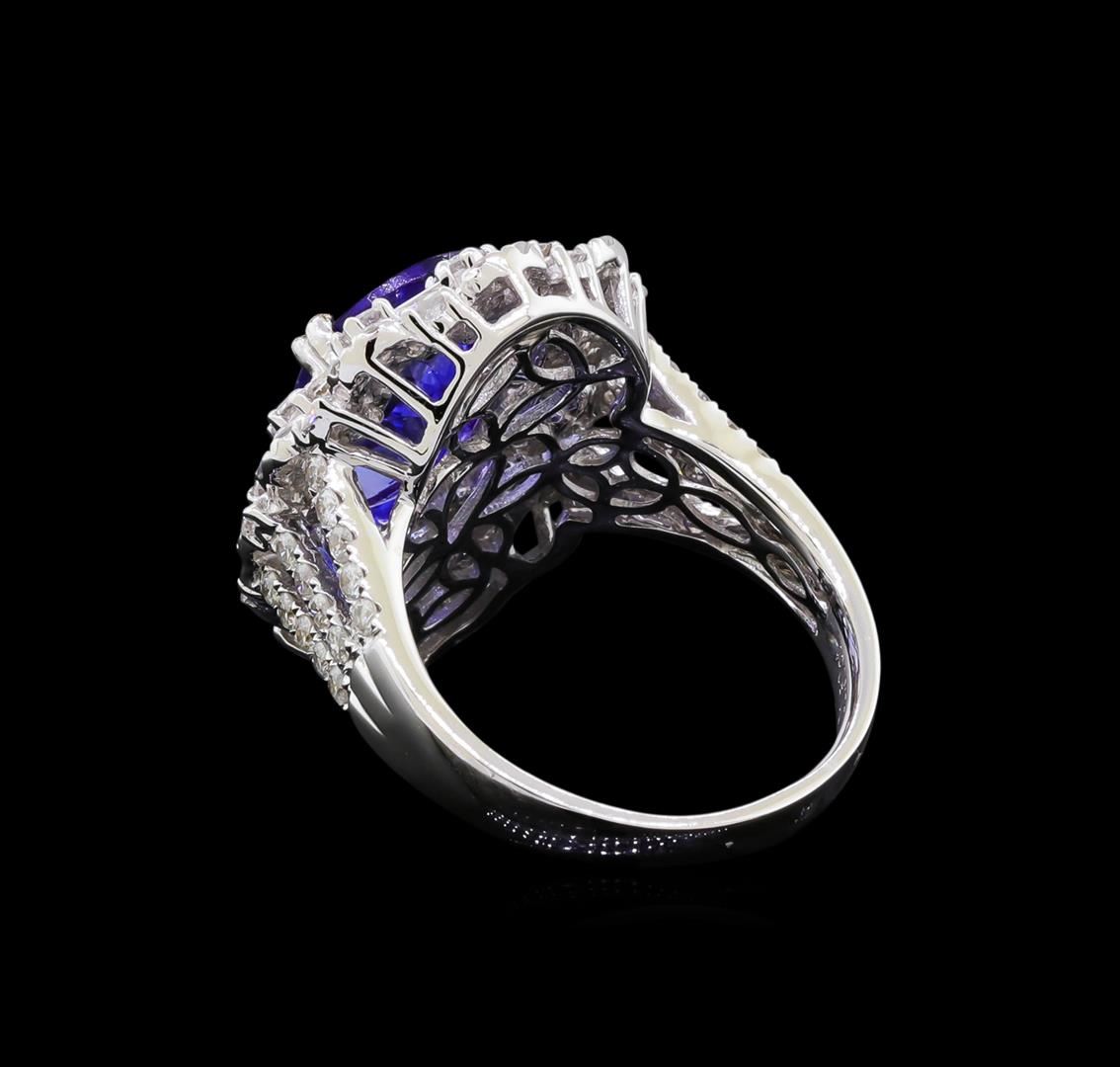 One electronically tested 14KT white gold ladies cast tanzanite and diamond ring with a bright polish finish. The featured tanzanite is set within tiered stylized diamond bezel supported by diamond set three-way split shoulders, completed by a two and one-half millimeter wide band. Trademark is Orianne. Identified with markings of "14K". Condition is new, good workmanship. Containing: One prong set pear mixed cut natural tanzanite, measuring 13.80 x 8.80 x 5.18mm, 6%. bulge factor, approximate weight of 4.47ct., clarity is eye clean, type I, medium dark, very slightly grayish, bluish violet color, (GIA bV 6/3), cut is good. Transmitting light with no distortion, transparent. Graded in the setting. Tanzanite is a very rare gemstone that is only found in the country of Tanzania. Originally discovered in 1967. Tiffany & Company, named the stone Tanzanite. It is found in the Usumburu Mountains that border the Umba Valley of northern Tanzania. Tanzanite occurs in gray, brown, violet, blue, reddish-purple, & green. The gem is interesting because of its exceptional pleochroism. Rotated in different directions a tanzanite will exhibit multiple changes of color. Tanzanite has a low tolerance to ultrasonic cleaning, and should not be cleaned using this method. One Hundred One prong set round brilliant & baguette cut diamonds approximate total weight of 101 Stones = 1.50ct. Graded in the setting. Clarity: VS-2 to I-1. Color: G - I. Total Weight of Colored Stones 4.47ct. Total Weight of Diamonds 1.50ct. Total Weight of Ring 7.83gm. AIG Appraised at $15,820.00.