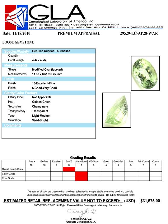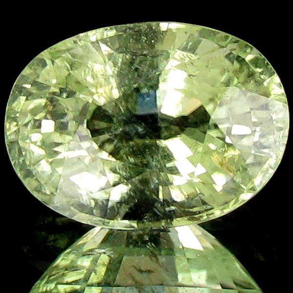 Excellent green champaigne colored specimen oval cut; lab quality evaluation 7; treatment as noted; Gem Guide wholesale $4470-$7823; full retail appraisal $31675; full lab evaluation included