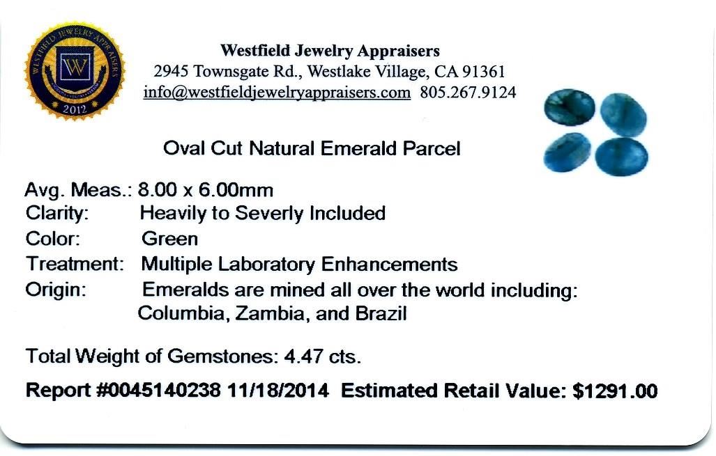 4.47cts. Oval Cut Natural Emerald Parcel Westfield Appraised at $1,291.00.