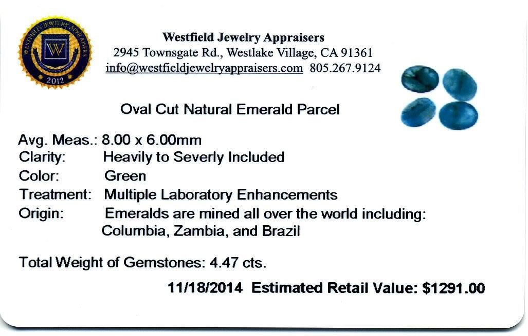 4.47cts. Oval Cut Natural Emerald Parcel Westfield Appraised at $1,291.00.