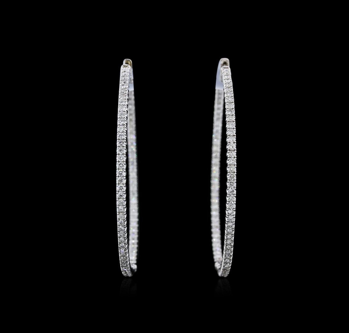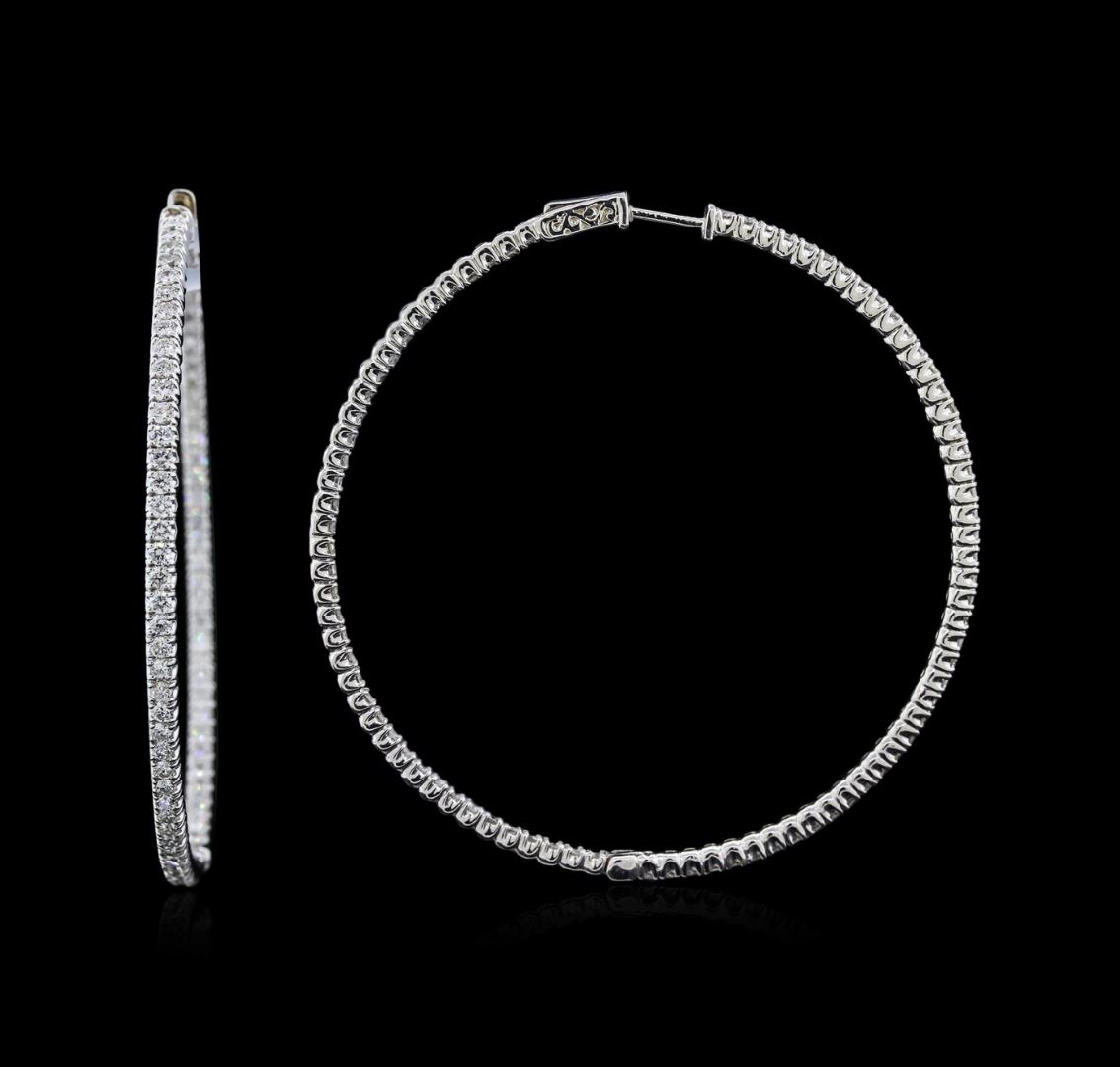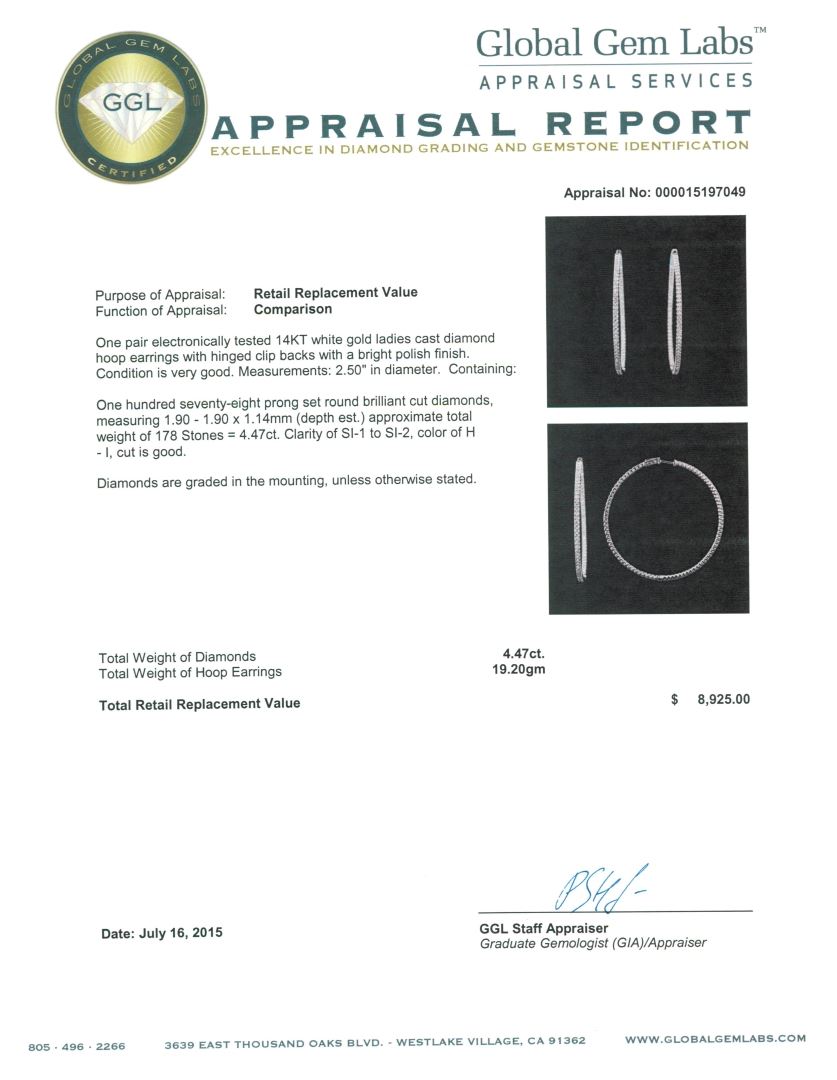 One pair electronically tested 14KT white gold ladies cast diamond hoop earrings with hinged clip backs with a bright polish finish. Measurements: 2.50" in diameter. Condition is very good. Containing: One Hundred Seventy-Eight prong set round brilliant cut diamonds, measuring 1.90 - 1.90 x 1.14mm (depth est.) approximate total weight of 178 Stones = 4.47ct. Clarity: SI-1 to SI-2. Color: H - I, Cut is Good. Diamonds are graded in the mounting, unless otherwise stated. Total Weight of Diamonds 4.47ct. Total Weight of Hoop Earrings 19.20 grams. GGL Appraised at $8,925.00.