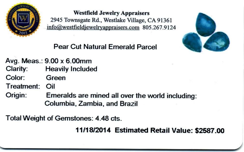 4.48cts. Pear Cut Natural Emerald Parcel Westfield Appraised at $2,587.00.