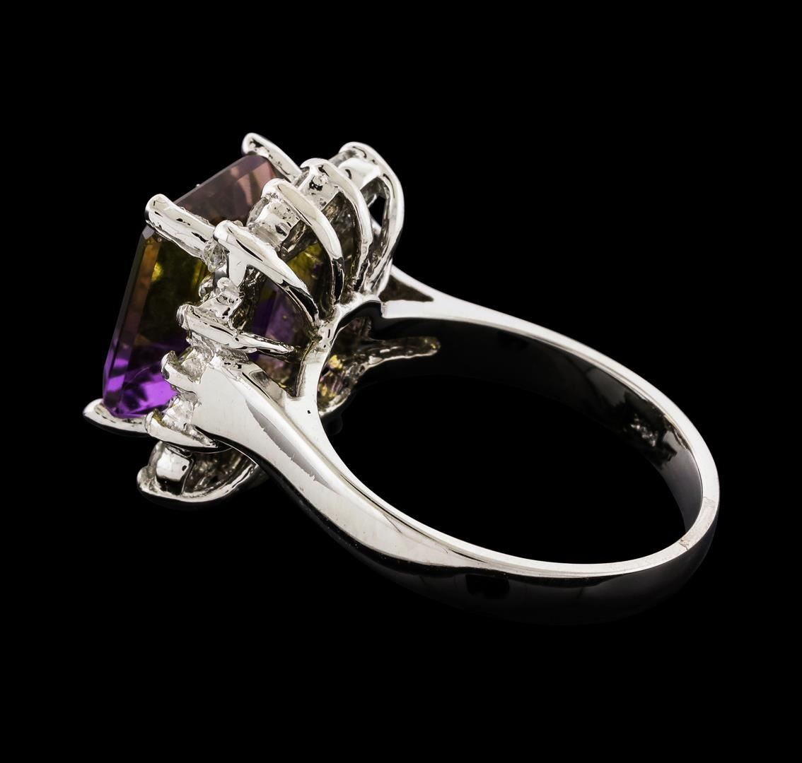 One Ametrine and Diamond Ring featuring: 14KT White Gold with a total weight of 5.72 grams, One Ametrine stone with a total weight of 4.48ct, and 14 Diamonds with a total weight of 0.90ctw.