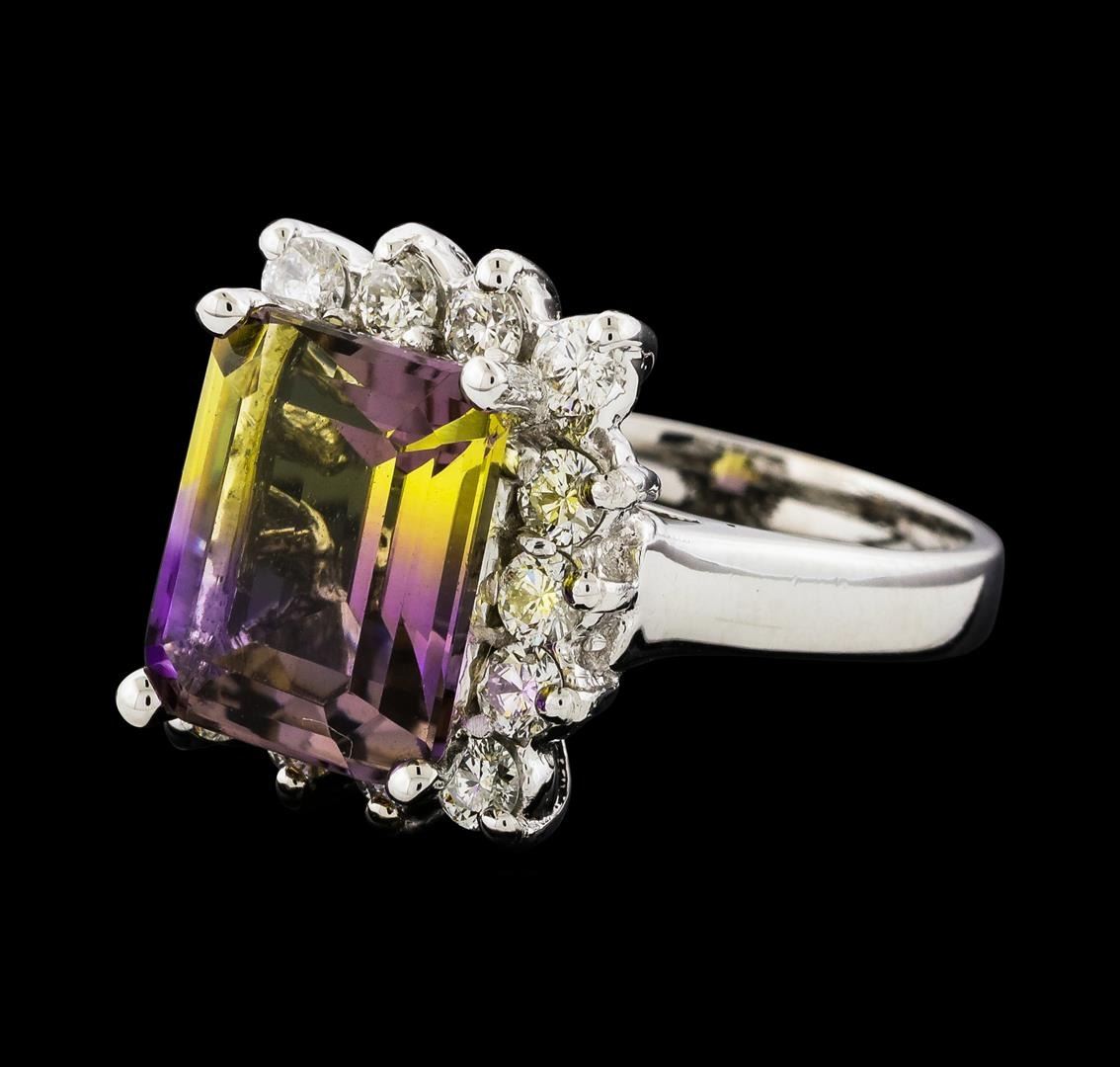 One Ametrine and Diamond Ring featuring: 14KT White Gold with a total weight of 5.72 grams, One Ametrine stone with a total weight of 4.48ct, and 14 Diamonds with a total weight of 0.90 ctw.