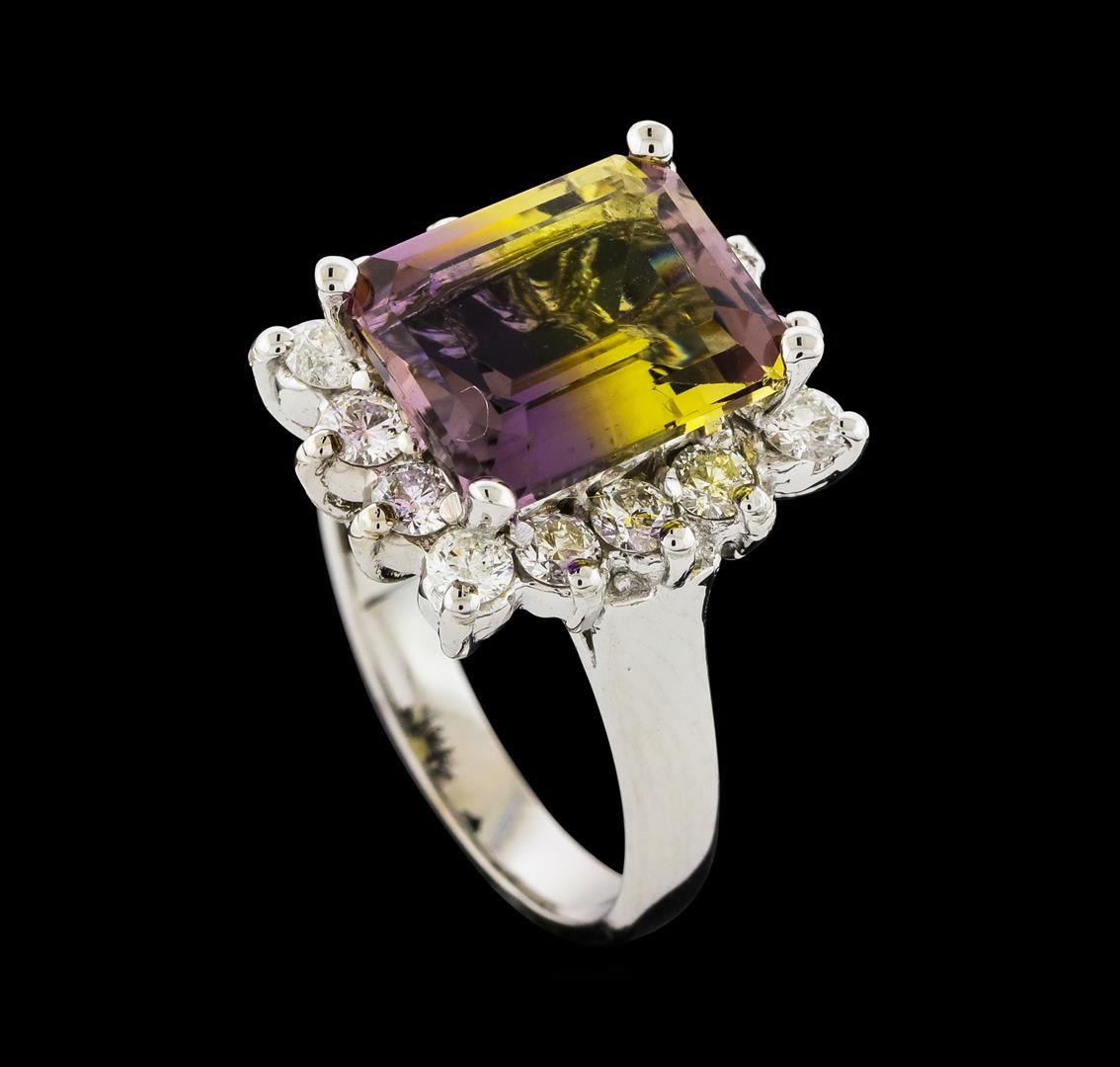 One Ametrine and Diamond Ring featuring: 14KT White Gold with a total weight of 5.72 grams, One Ametrine stone with a total weight of 4.48ct, and 14 Diamonds with a total weight of 0.90 ctw.