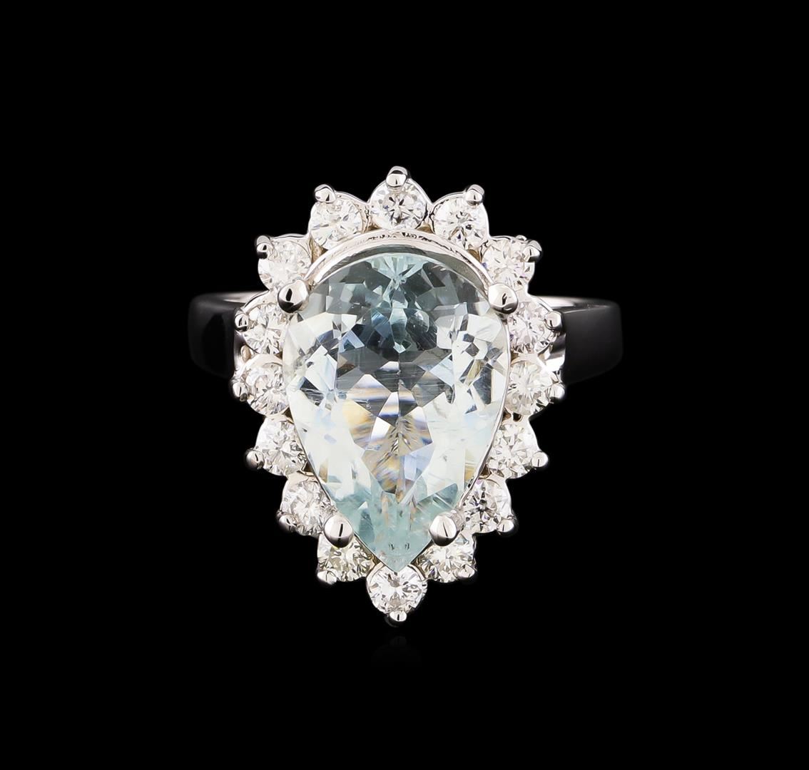One electronically tested 14KT white gold lady's cast fashion ring with a basket halo with a bright polish finish. The featured lady's ring has a shank measuring 2.32 millimeters wide. Identified with markings of "14K". Condition is new, good workmanship. Containing: One prong set pear modified brilliant cut natural aquamarine, measuring 14.05 x 9.95 x 6.14mm, approximate weight of 4.48ct., clarity is slightly included, light, moderately strong, very slightly greenish blue color, (GIA vslgB 3/4), cut is very good. Transmitting light with a minimum of distortion, transparent. Colored gemstones are presumed to have been subjected to commonly used enhancement processes. Graded in the setting. Sixteen prong set round brilliant cut diamonds, measuring 2.40 - 2.30 x 1.46mm (depth est.) approximate total weight of 16 Stones = 0.80ct. Graded in the setting. Clarity: SI-1 to SI-2. Color: H - I. Cut Good. Total Weight of Colored Stones 4.48ct. Total Weight of Diamonds 0.80ct. Total Weight of Ring 6.80gm. GAS Appraised at $8,395.00.