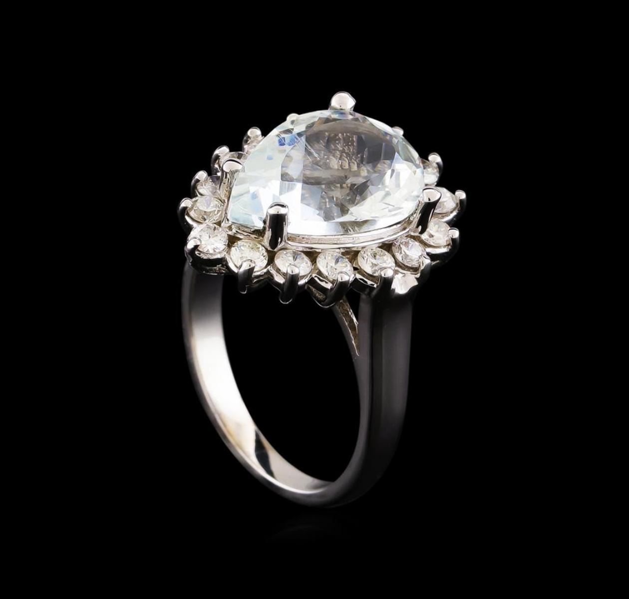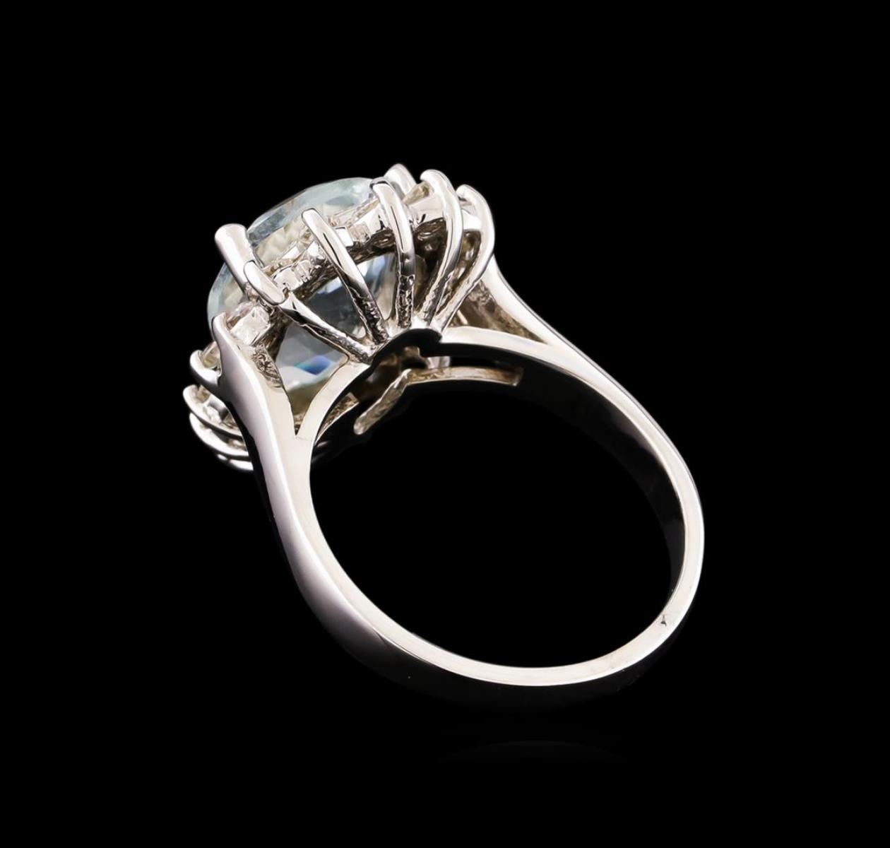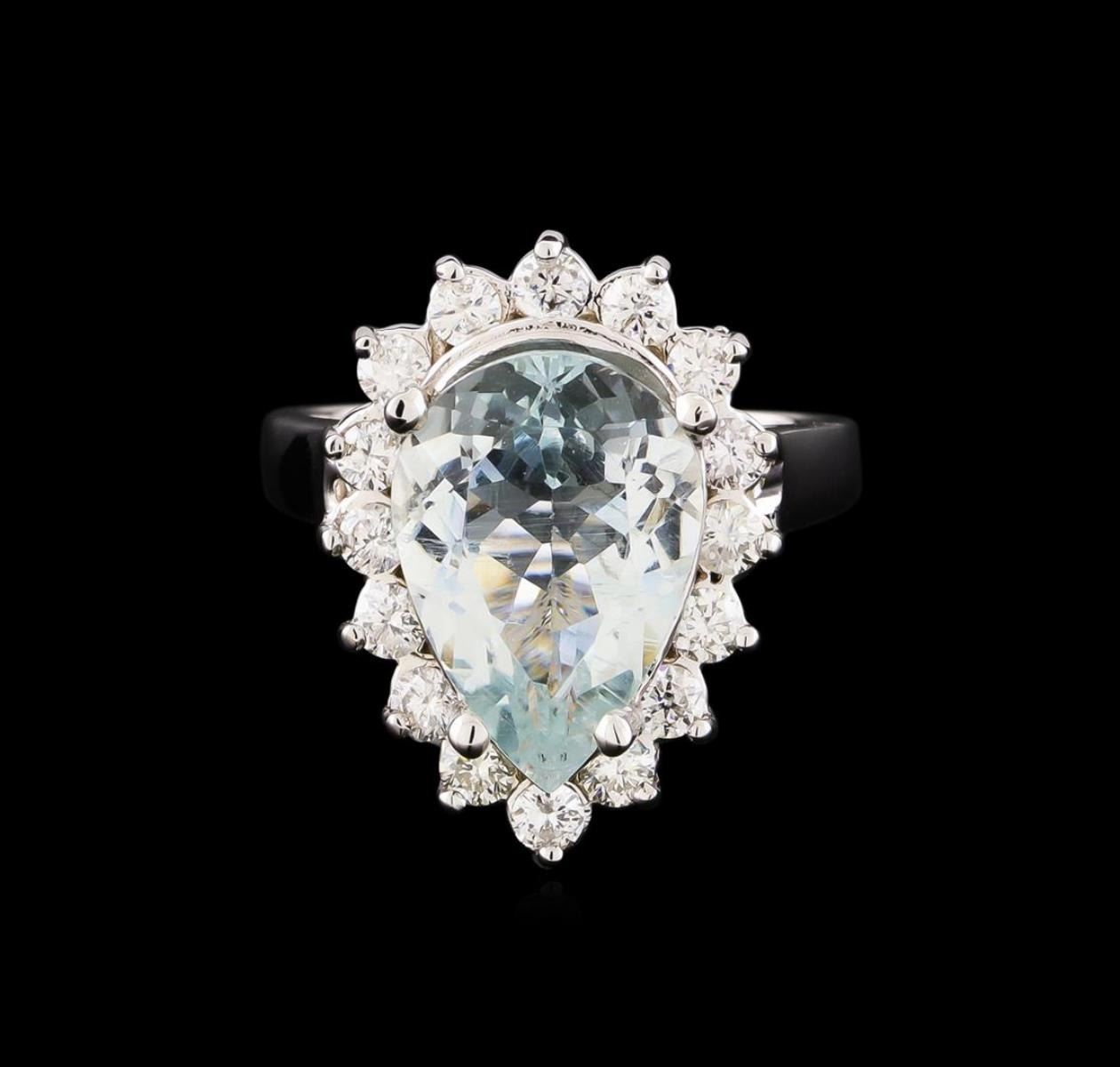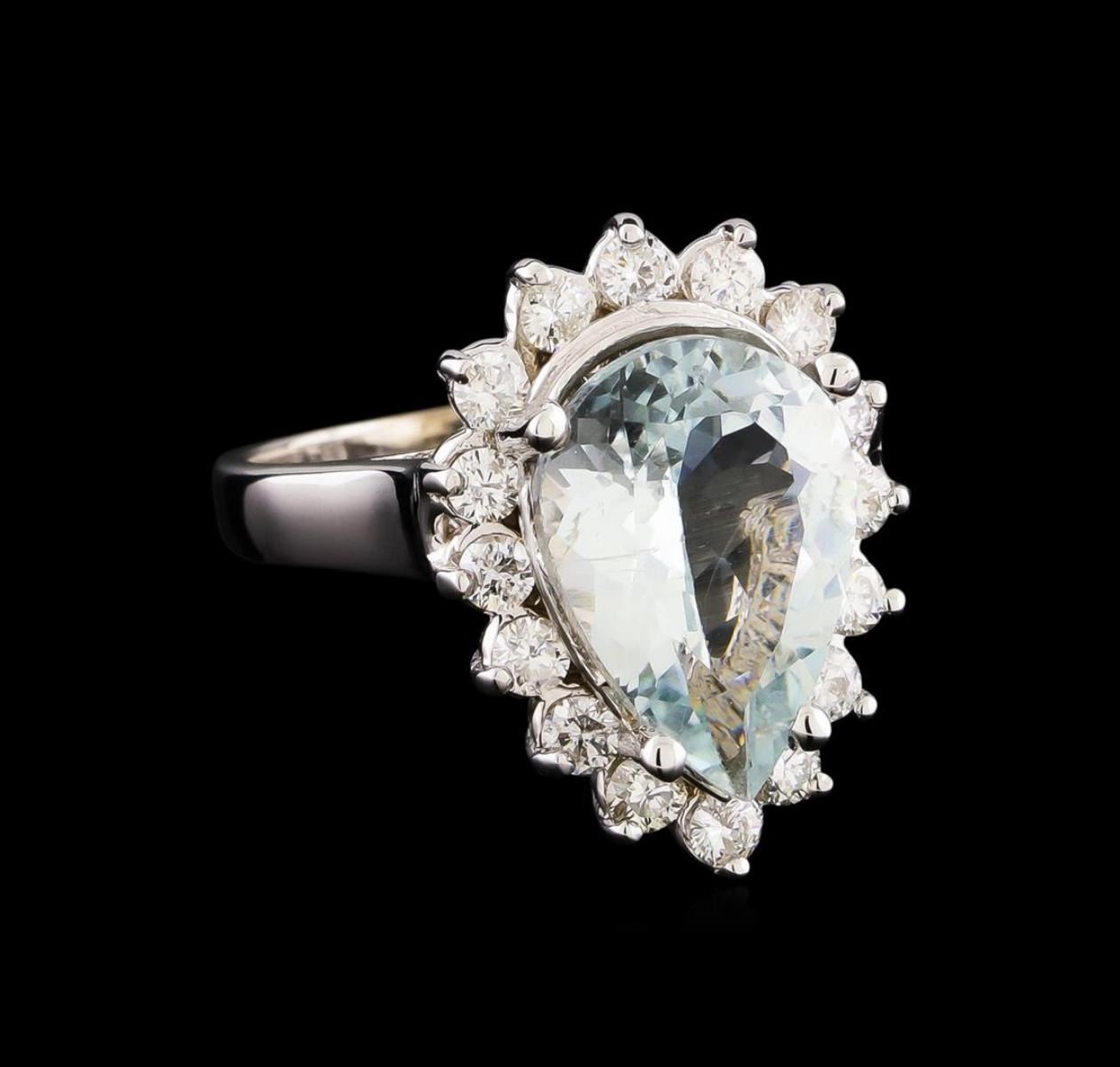 One electronically tested 14KT white gold lady's cast fashion ring with a basket halo with a bright polish finish. The featured lady's ring has a shank measuring 2.32 millimeters wide. Identified with markings of "14K". Condition is new, good workmanship. Containing: One prong set pear modified brilliant cut natural aquamarine, measuring 14.05 x 9.95 x 6.14mm, approximate weight of 4.48ct., clarity is slightly included, light, moderately strong, very slightly greenish blue color, (GIA vslgB 3/4), cut is very good. Transmitting light with a minimum of distortion, transparent. Colored gemstones are presumed to have been subjected to commonly used enhancement processes. Graded in the setting. Sixteen prong set round brilliant cut diamonds, measuring 2.40 - 2.30 x 1.46mm (depth est.) approximate total weight of 16 Stones = 0.80 ct. Graded in the setting. Clarity: SI-1 to SI-2. Color: H - I. Cut Good. Total Weight of Colored Stones 4.48ct. Total Weight of Diamonds 0.80 ct. Total Weight of Ring 6.80gm. GAS Appraised.