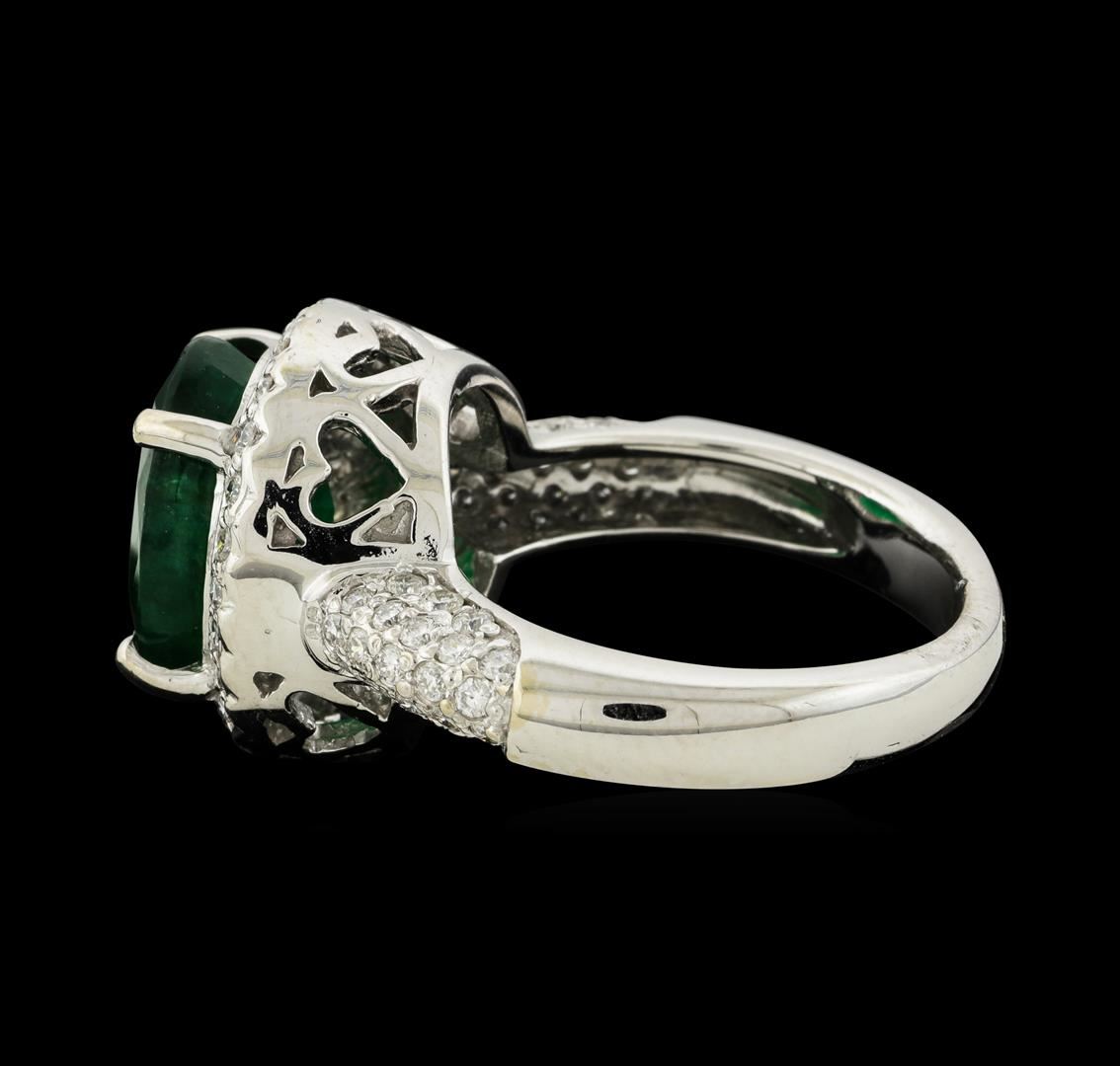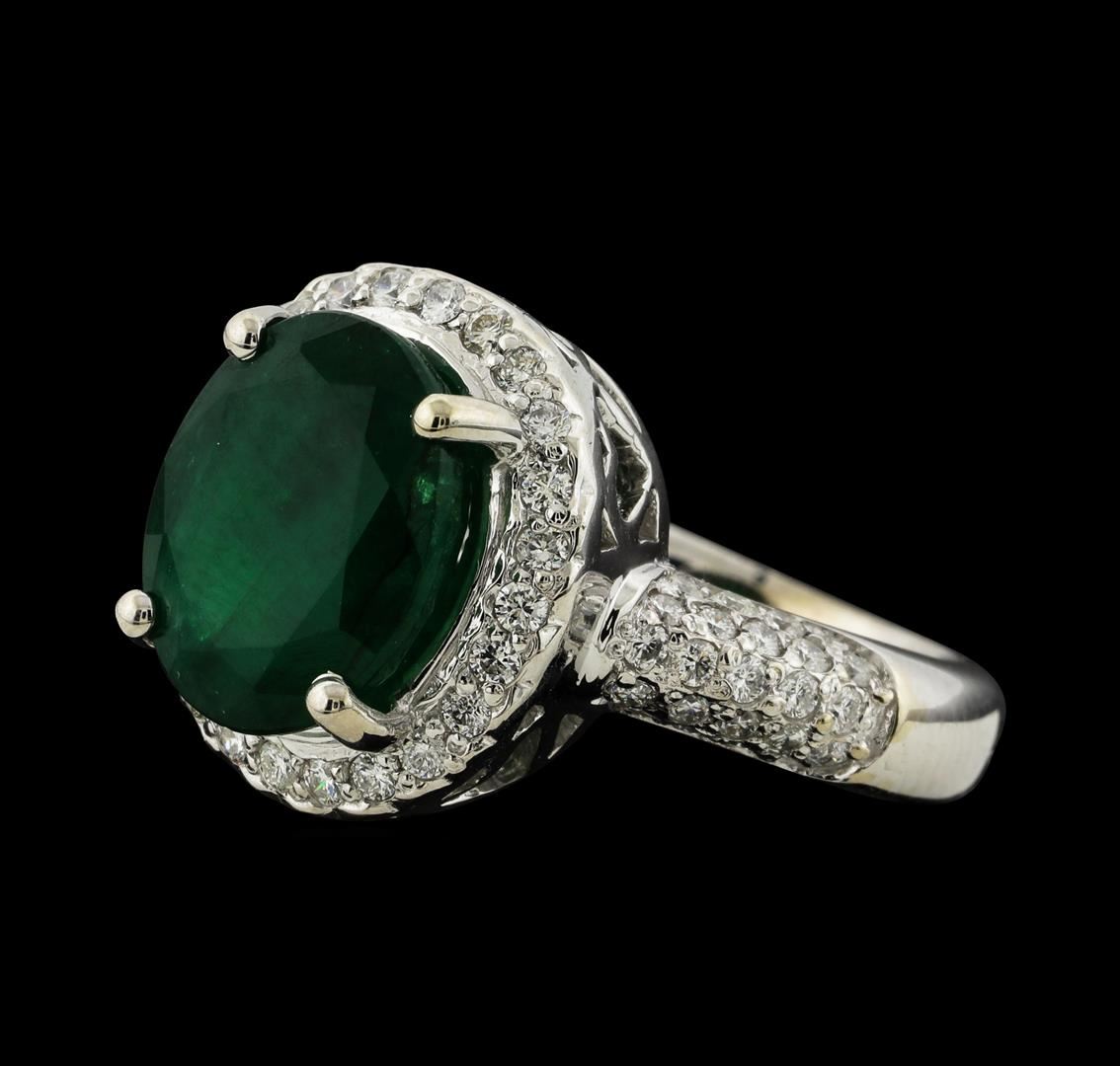 One electronically tested 14KT white gold lady's cast fashion ring with a cathedral halo with a bright polish finish. The featured lady's ring has a shank measuring 3.20 millimeters wide. Identified with markings of '14K'. Condition is new, good workmanship. Containing: One prong set oval modified mixed cut natural emerald, measuring 11.80 x 9.40 x 6.19mm, (depth est.) 10%. bulge factor, approximate weight of 4.48ct., clarity is heavily included, medium dark, moderately strong, green color, (GIA G 6/4), cut is good. Transmitting light somewhat diffusely, semi-transparent to translucent. Indications of oil residue. Naturally occurring internal & external characteristics are present. Colored gemstones are presumed to have been subjected to commonly used enhancement processes. Graded in the setting. Sixty-Four prong set round brilliant cut diamonds, measuring 1.50 - 1.35 x 0.87mm (depth est.) approximate total weight of 64 Stones = 0.68ct. Graded in the setting. Clarity SI-1 to SI-2. Color: H - I Cut Good. Total Weight of Colored Stones 4.48ct.. Total Weight of Diamonds 0.68ct.. Total Weight of Ring 8.20gm. GAS Appraised at $7,085.00.
