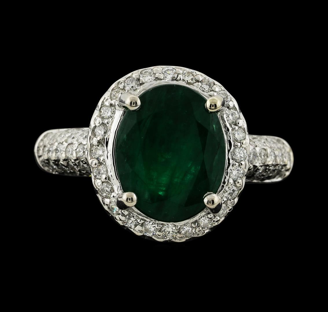 One electronically tested 14KT white gold lady's cast fashion ring with a cathedral halo with a bright polish finish. The featured lady's ring has a shank measuring 3.20 millimeters wide. Identified with markings of '14K'. Condition is new, good workmanship. Containing: One prong set oval modified mixed cut natural emerald, measuring 11.80 x 9.40 x 6.19mm, (depth est.) 10%. bulge factor, approximate weight of 4.48ct., clarity is heavily included, medium dark, moderately strong, green color, (GIA G 6/4), cut is good. Transmitting light somewhat diffusely, semi-transparent to translucent. Indications of oil residue. Naturally occurring internal & external characteristics are present. Colored gemstones are presumed to have been subjected to commonly used enhancement processes. Graded in the setting. Sixty-Four prong set round brilliant cut diamonds, measuring 1.50 - 1.35 x 0.87mm (depth est.) approximate total weight of 64 Stones = 0.68ct. Graded in the setting. Clarity SI-1 to SI-2. Color: H - I Cut Good. Total Weight of Colored Stones 4.48ct.. Total Weight of Diamonds 0.68ct.. Total Weight of Ring 8.20gm. GAS Appraised at $7,085.00.