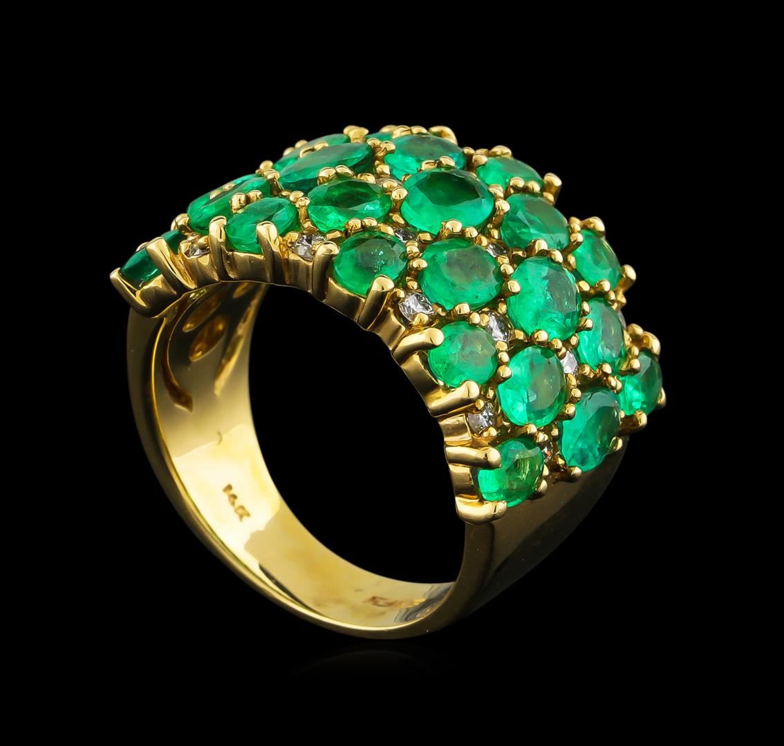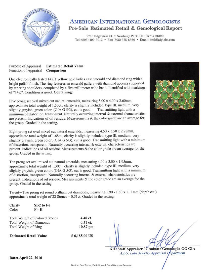 One electronically tested 14KT yellow gold ladies cast emerald and diamond ring with a bright polish finish. The ring features an emerald gallery with diamond accents supported by tapering shoulders, completed by a five millimeter wide band. Identified with markings of "14K". Condition is good. Containing: Five prong set oval mixed cut natural emeralds, measuring 5.00 x 4.00 x 2.60mm, approximate total weight of 1.50ct., clarity is slightly included, type III, medium, very slightly grayish, green color, (GIA G 5/3), cut is good. Transmitting light with a minimum of distortion, transparent. Naturally occurring internal & external characteristics are present. Indications of oil residue. Measurements & the color grade are an average for the group. Graded in the setting. Eight prong set oval mixed cut natural emeralds, measuring 4.50 x 3.50 x 2.28mm, approximate total weight of 1.68ct., clarity is slightly included, type III, medium, very slightly grayish, green color, (GIA G 5/3), cut is good. Transmitting light with a minimum of distortion, transparent. Naturally occurring internal & external characteristics are present. Indications of oil residue. Measurements & the color grade are an average for the group. Graded in the setting. Ten prong set oval mixed cut natural emeralds, measuring 4.00 x 3.00 x 1.95mm, approximate total weight of 1.30ct., clarity is slightly included, type III, medium, very slightly grayish, green color, (GIA G 5/3), cut is good. Transmitting light with a minimum of distortion, transparent. Naturally occurring internal & external characteristics are present. Indications of oil residue. Measurements & the color grade are an average for the group. Graded in the setting. Twenty-Two prong set round brilliant cut diamonds, measuring 1.90 - 1.80 x 1.11mm (depth est.) approximate total weight of 22 Stones = 0.51ct. Graded in the setting. Clarity: SI-2 to I-2. Color: F - H. Total Weight of Colored Stones 4.48ct. Total Weight of Diamonds 0.51ct. Total Weight of Ring 10.87gm. AIG Appraised at $6,185.00.