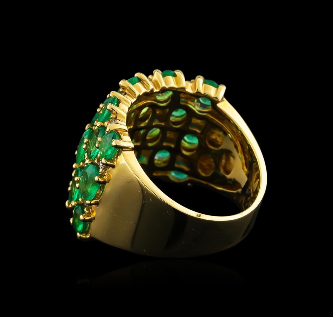 One electronically tested 14KT yellow gold ladies cast emerald and diamond ring with a bright polish finish. The ring features an emerald gallery with diamond accents supported by tapering shoulders, completed by a five millimeter wide band. Identified with markings of "14K". Condition is good. Containing: Five prong set oval mixed cut natural emeralds, measuring 5.00 x 4.00 x 2.60mm, approximate total weight of 1.50ct., clarity is slightly included, type III, medium, very slightly grayish, green color, (GIA G 5/3), cut is good. Transmitting light with a minimum of distortion, transparent. Naturally occurring internal & external characteristics are present. Indications of oil residue. Measurements & the color grade are an average for the group. Graded in the setting. Eight prong set oval mixed cut natural emeralds, measuring 4.50 x 3.50 x 2.28mm, approximate total weight of 1.68ct., clarity is slightly included, type III, medium, very slightly grayish, green color, (GIA G 5/3), cut is good. Transmitting light with a minimum of distortion, transparent. Naturally occurring internal & external characteristics are present. Indications of oil residue. Measurements & the color grade are an average for the group. Graded in the setting. Ten prong set oval mixed cut natural emeralds, measuring 4.00 x 3.00 x 1.95mm, approximate total weight of 1.30ct., clarity is slightly included, type III, medium, very slightly grayish, green color, (GIA G 5/3), cut is good. Transmitting light with a minimum of distortion, transparent. Naturally occurring internal & external characteristics are present. Indications of oil residue. Measurements & the color grade are an average for the group. Graded in the setting. Twenty-Two prong set round brilliant cut diamonds, measuring 1.90 - 1.80 x 1.11mm (depth est.) approximate total weight of 22 Stones = 0.51ct. Graded in the setting. Clarity: SI-2 to I-2. Color: F - H. Total Weight of Colored Stones 4.48ct. Total Weight of Diamonds 0.51ct. Total Weight of Ring 10.87gm. AIG Appraised at $6,185.00.