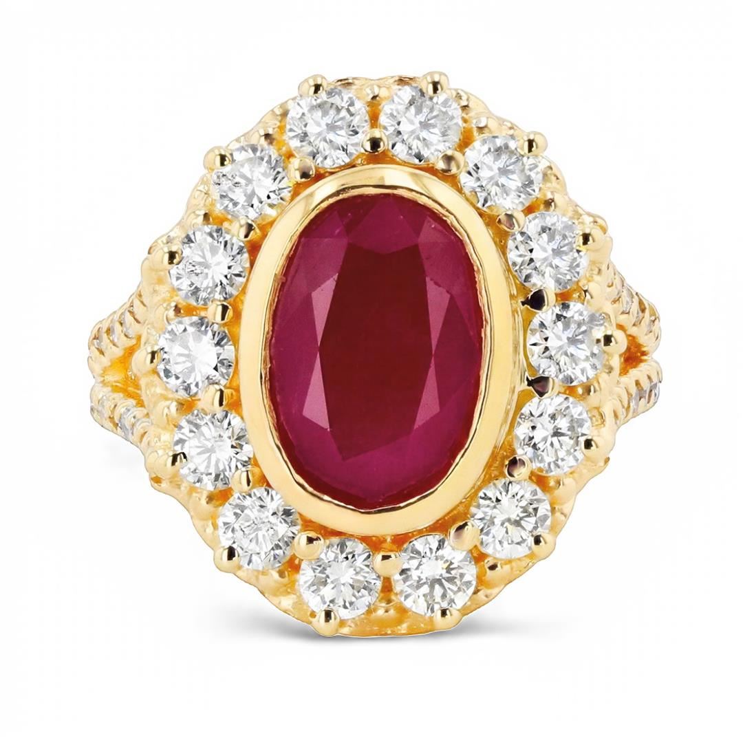 4.48ct Ruby and 1.58ctw Diamond 18K Yellow Gold Ring. Please see Photos and Description for all available information. This unique ring features a 4.48ct ruby center stone, surrounded by 1.58ctw of round diamonds and set on a 18K yellow gold band. The ring is available in size 5 3/4.