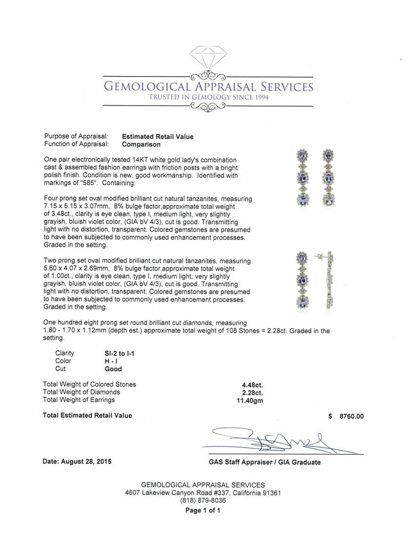 One pair electronically tested 14KT white gold lady's combination cast & assembled fashion earrings with friction posts with a bright polish finish. Identified with markings of "585". Condition is new, good workmanship. Containing: Four prong set oval modified brilliant cut natural tanzanites, measuring 7.15 x 5.15 x 3.07mm, 8% bulge factor, approximate total weight of 3.48ct., clarity is eye clean, type I, medium light, very slightly grayish, bluish violet color, (GIA bV 4/3), cut is good. Transmitting light with no distortion, transparent. Colored gemstones are presumed to have been subjected to commonly used enhancement processes. Graded in the setting. Two prong set oval modified brilliant cut natural tanzanites, measuring 5.60 x 4.07 x 2.69mm, 8% bulge factor, approximate total weight of 1.00ct., clarity is eye clean, type I, medium light, very slightly grayish, bluish violet color, (GIA bV 4/3), cut is good. Transmitting light with no distortion, transparent. Colored gemstones are presumed to have been subjected to commonly used enhancement processes. Graded in the setting. One Hundred Eight prong set round brilliant cut diamonds, measuring 1.80 - 1.70 x 1.12mm (depth est.) approximate total weight of 108 Stones = 2.28ct. Graded in the setting. Clarity: SI-2 to I-1. Color: H - I. Cut Good. Total Weight of Colored Stones 4.48ct. Total Weight of Diamonds 2.28ct. Total Weight of Earrings 11.40gm. GAS Appraised at $8,760.00.