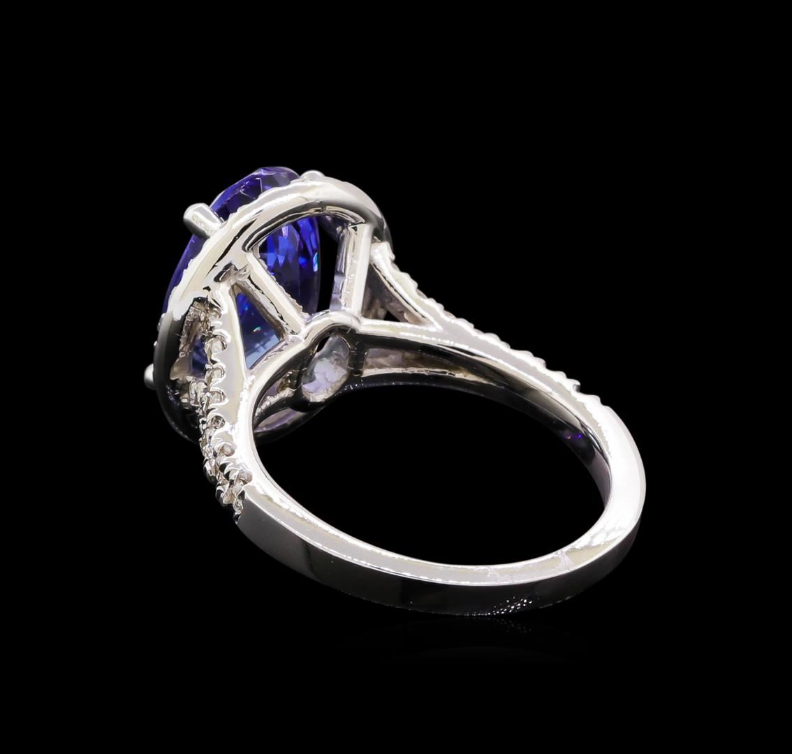 One electronically tested 14KT white gold lady's cast fashion ring with a split shank halo with a bright polish finish. Featured lady's ring has a shank measuring 2.10 millimeters in width. Identified with markings of "14K". Condition is new, good workmanship. Containing: One prong set oval modified brilliant cut natural tanzanite, measuring 12.81 x 8.27 x 5.44mm, (depth est.) approximate weight of 4.48ct., clarity is eye clean, medium, very slightly grayish, violetish blue color, (GIA vB 5/3), cut is very good. Transmitting light with no distortion, transparent. Colored gemstones are presumed to have been subjected to commonly used enhancement processes. Graded in the setting. Six prong set round brilliant cut diamonds, measuring 1.50 - 1.40 x 0.91mm (depth est.) approximate total weight of 6 Stones = 0.08ct. Graded in the setting. Clarity: SI-1 to SI-2. Color: G - Good Thirty-Eight prong set round brilliant cut diamonds, measuring 1.40 - 1.30 x 0.81mm (depth est.) approximate total weight of 38 Stones = 0.33ct. Graded in the setting. Clarity: SI-1 to I-1. Color: G - Good. Total Weight of Colored Stones 4.48ct. Total Weight of Diamonds 0.41ct. Total Weight of Ring 5.30gm. GAS Appraised at $8,900.00.
