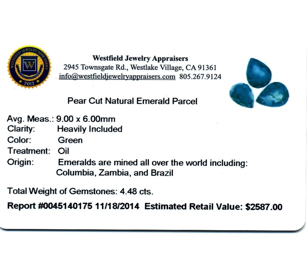 4.48cts. Pear Cut Natural Emerald Parcel Westfield Appraised at $2,587.00.