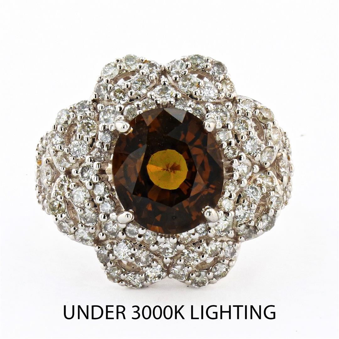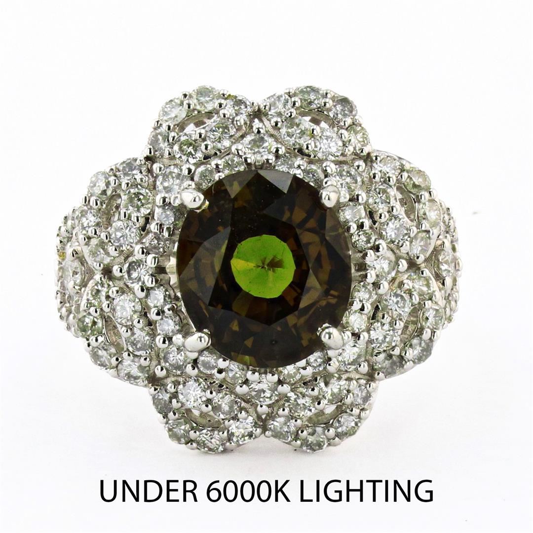 4.49ct Alexandrite and 1.43ctw Diamond 18K White Gold Ring (GIA CERTIFIED). Description: One 18k White Gold Alexandrite and Diamond Ring. Weighing 7.82 Grams. Containing: One Oval Brilliant/Step Cut Natural Alexandrite GIA Report Number: 5206321940 Measurements: 10.21 x 8.92 x 6.03mm Height: 4.49 carat Color: Brownish Green changing to Brownish Orange Transparency: Transparent One Hundred Eight round brilliant-cut diamonds in prong set Total Weight: 1.43 carats Average Color: G-H Average Clarity: SI2-I1
