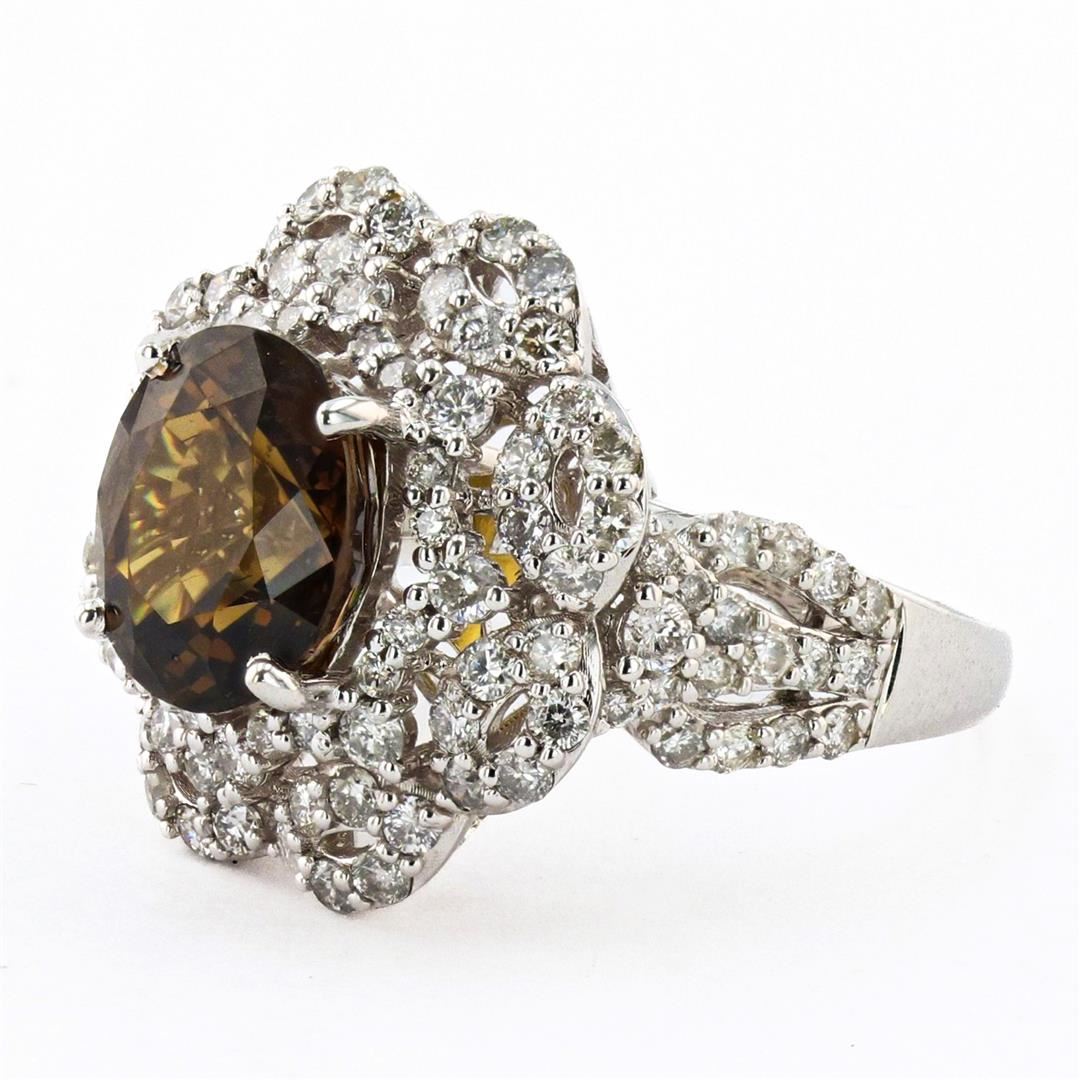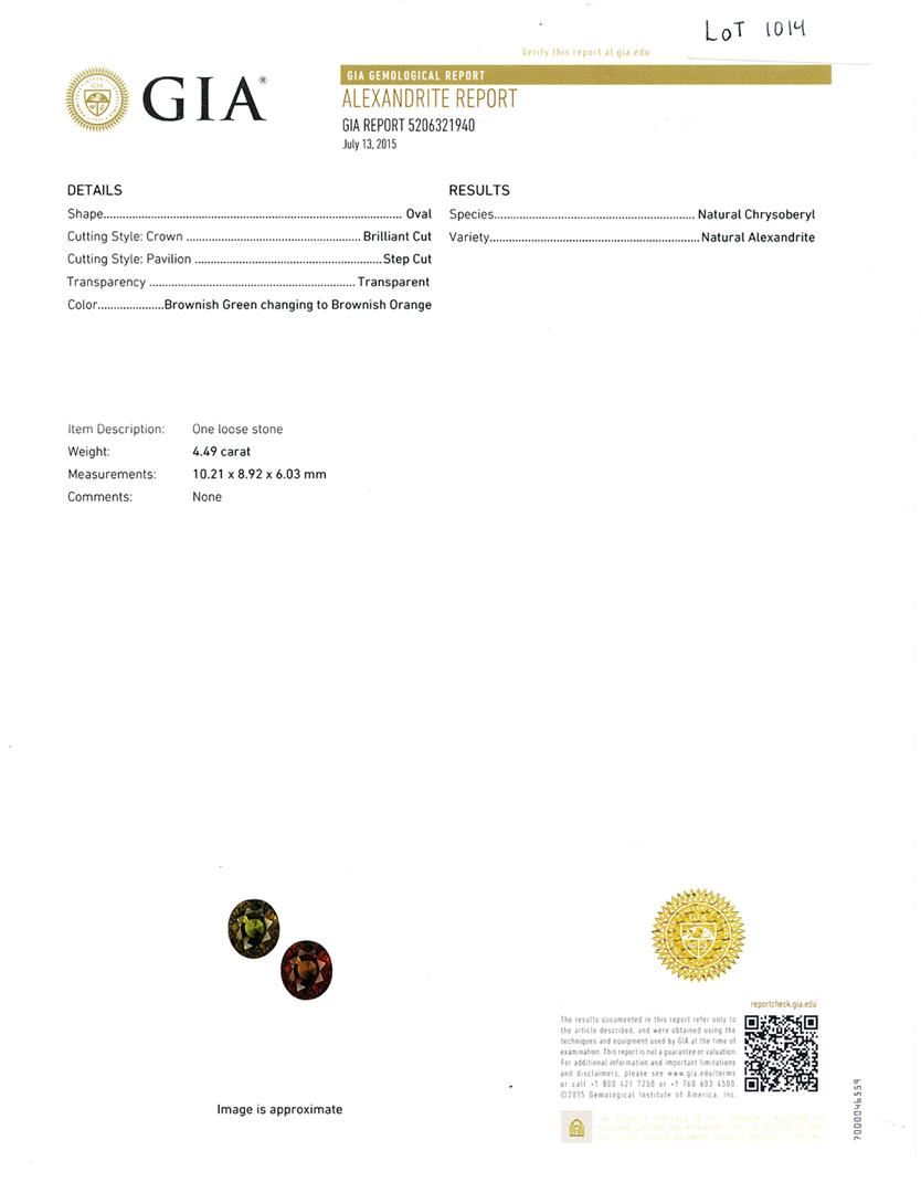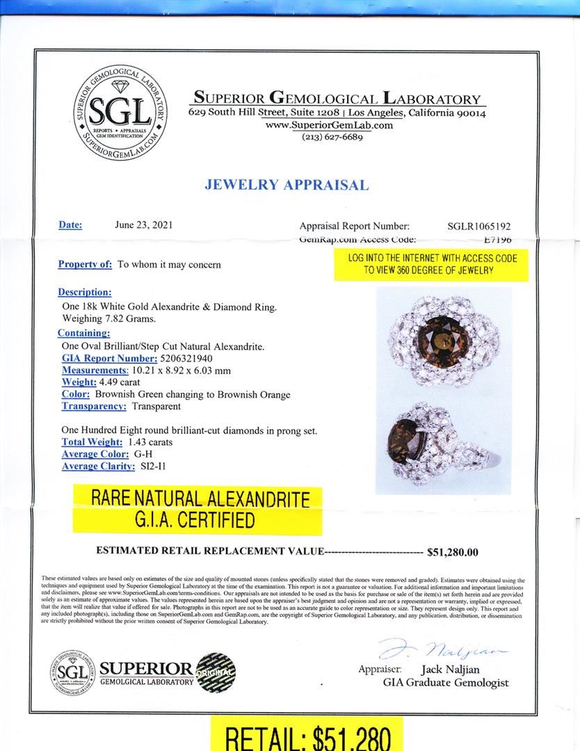 #Description:# One 18k White Gold Alexandrite and Diamond Ring. Weighing 7.82 Grams. #Containing:# One Oval Brilliant/Step Cut Natural Alexandrite GIA Report Number: 5206321940 Measurements: 10.21 x 8.92 x 6.03mm Height: 4.49 carat Color: Brownish Green c