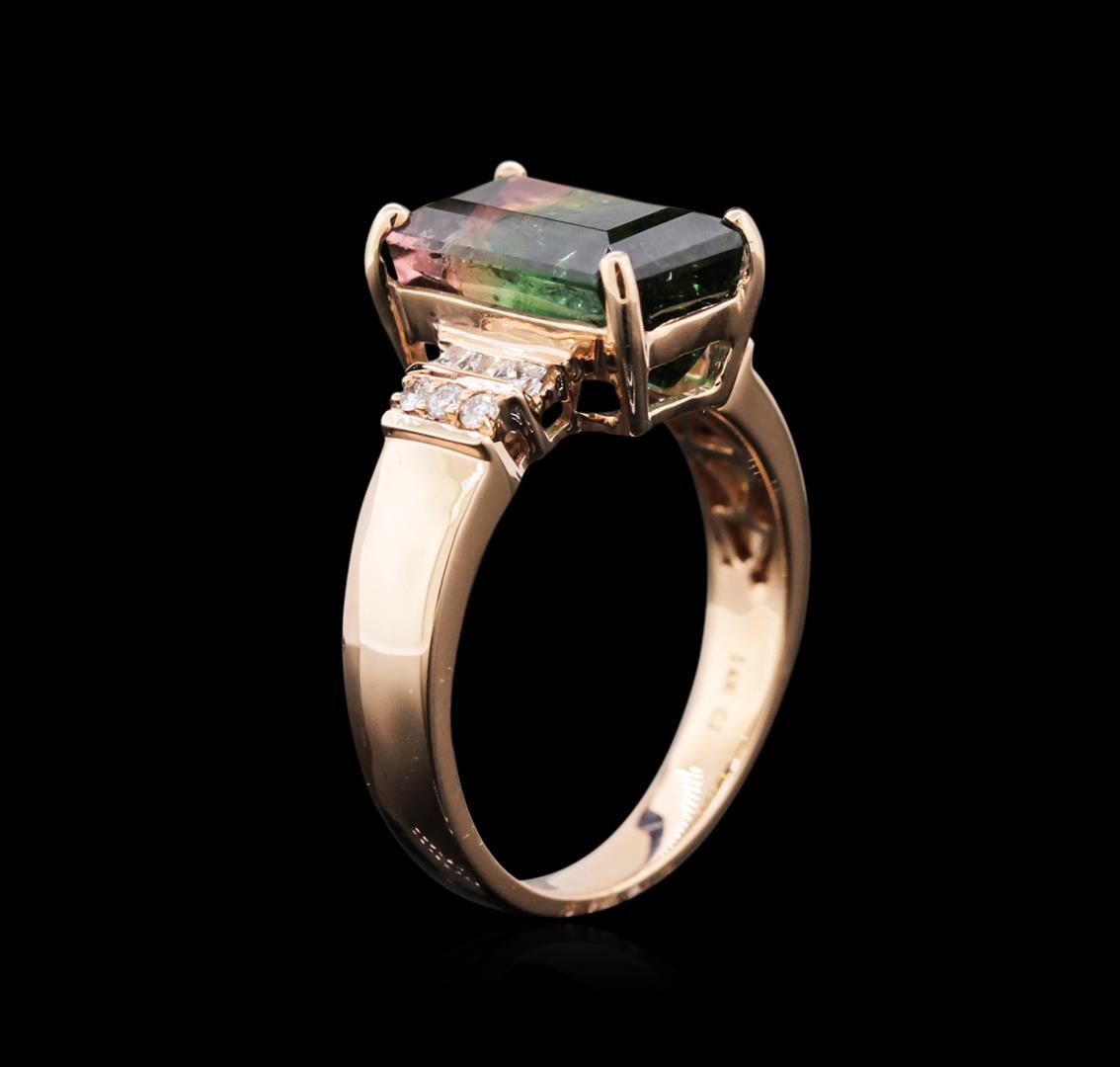 One ring featuring: 14KT rose gold weighing 4.12 grams containing one bi-color tourmaline center stone with a total weight of 4.49ct and six diamonds.