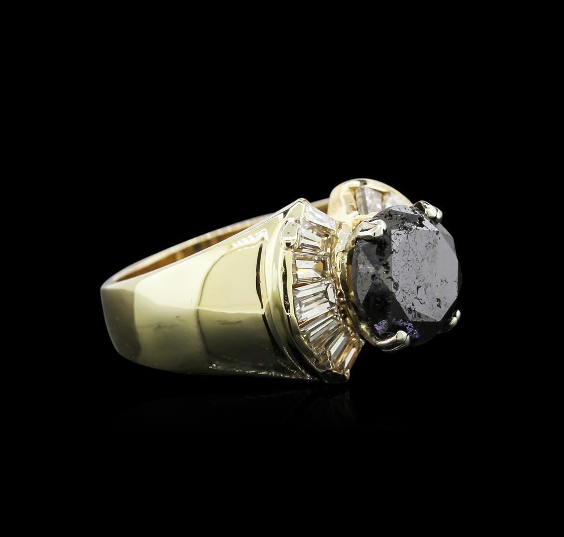 One electronically tested 14KT yellow gold lady's cast tapered ring with a half round shank with a bright polish finish. The featured lady's ring has a shank measuring 4.34 millimeters in width. Identified with markings of "14K". Condition is new, good workmanship. Containing: One prong set round brilliant cut diamond, measuring 9.42 - 9.38 x 5.73mm (depth est.) approximate weight of 2.99ct. Colored gemstones are presumed to have been subjected to commonly used enhancement processes. Graded in the setting. Cut Good Fourteen channel set baguette cut diamonds, measuring from 3.50 x 1.80 x 1.53mm (depth est.) to 3.75 x 2.30 x 1.96mm (depth est.) approximate total weight of 14 Stones = 1.50ct. Graded in the setting. Clarity: VS-1 to VS-2. Color: H - J. Cut Good. Total Weight of Diamonds 4.49ct. Total Weight of Ring 9.50gm. GAS Appraised at $6,180.00.