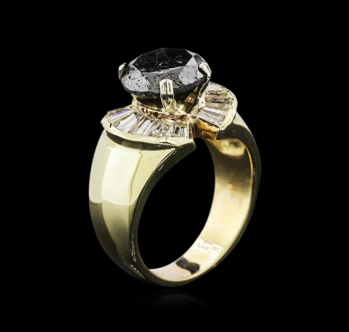 One electronically tested 14KT yellow gold lady's cast tapered ring with a half round shank with a bright polish finish. The featured lady's ring has a shank measuring 4.34 millimeters in width. Identified with markings of "14K". Condition is new, good workmanship. Containing: One prong set round brilliant cut diamond, measuring 9.42 - 9.38 x 5.73mm (depth est.) approximate weight of 2.99ct. Colored gemstones are presumed to have been subjected to commonly used enhancement processes. Graded in the setting. Cut Good Fourteen channel set baguette cut diamonds, measuring from 3.50 x 1.80 x 1.53mm (depth est.) to 3.75 x 2.30 x 1.96mm (depth est.) approximate total weight of 14 Stones = 1.50ct. Graded in the setting. Clarity: VS-1 to VS-2. Color: H - J. Cut Good. Total Weight of Diamonds 4.49ct. Total Weight of Ring 9.50gm. GAS Appraised at $6,180.00.